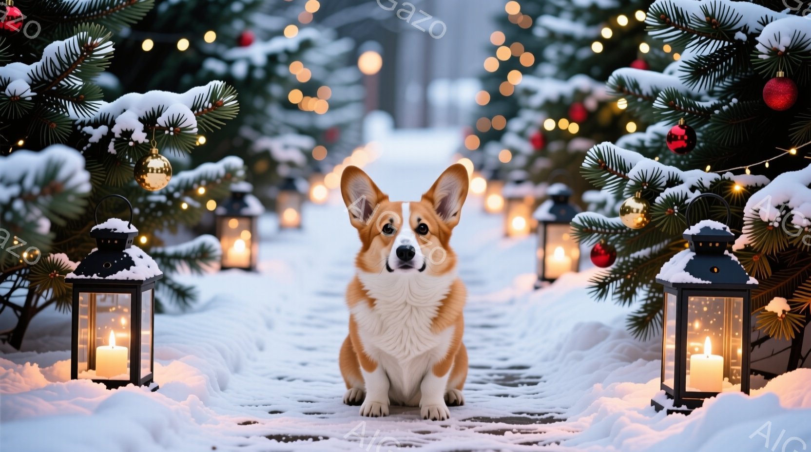 雪に覆われた道の中央に、コルギ犬が座っています。犬は落ち着いた表情で、まっすぐカメラを見ています。背景にはクリスマスツリーと点灯されたランタンが並び、雪景色が幻想的な雰囲気を醸し出しています。