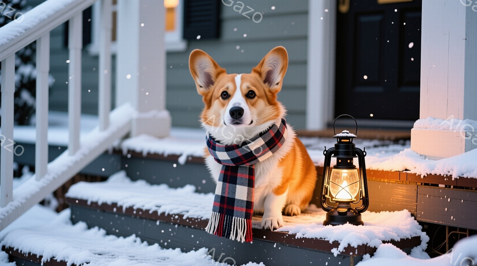 雪景色の中、コーギー犬が正面を向き、まっすぐ座っています。両脇には点灯したランタンが並び、背景にはクリスマスの飾り付けがされたモミの木が雪に覆われて見えます。温かい光と雪景色が組み合わさり、幻想的で穏やかなクリスマスの雰囲気を醸し出しています。