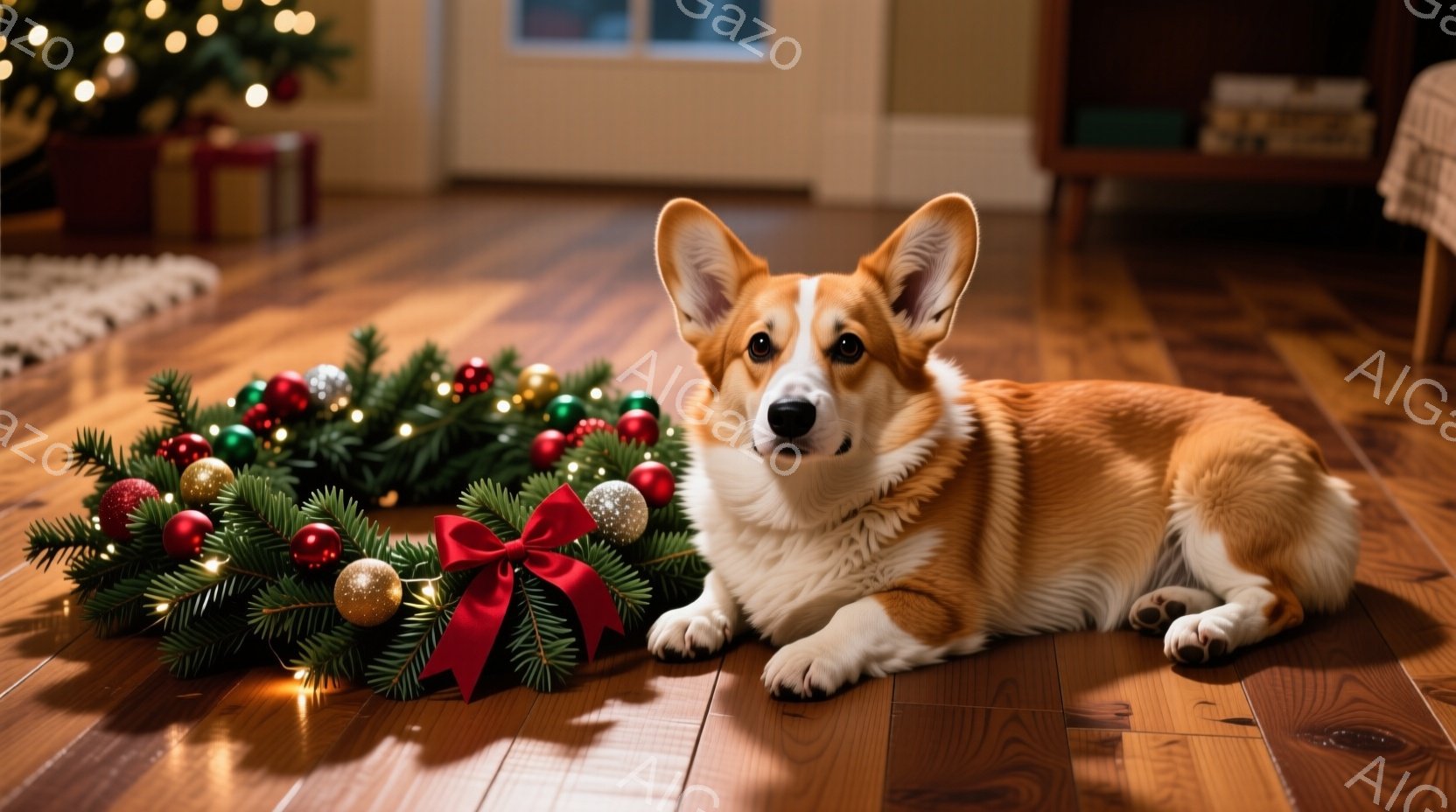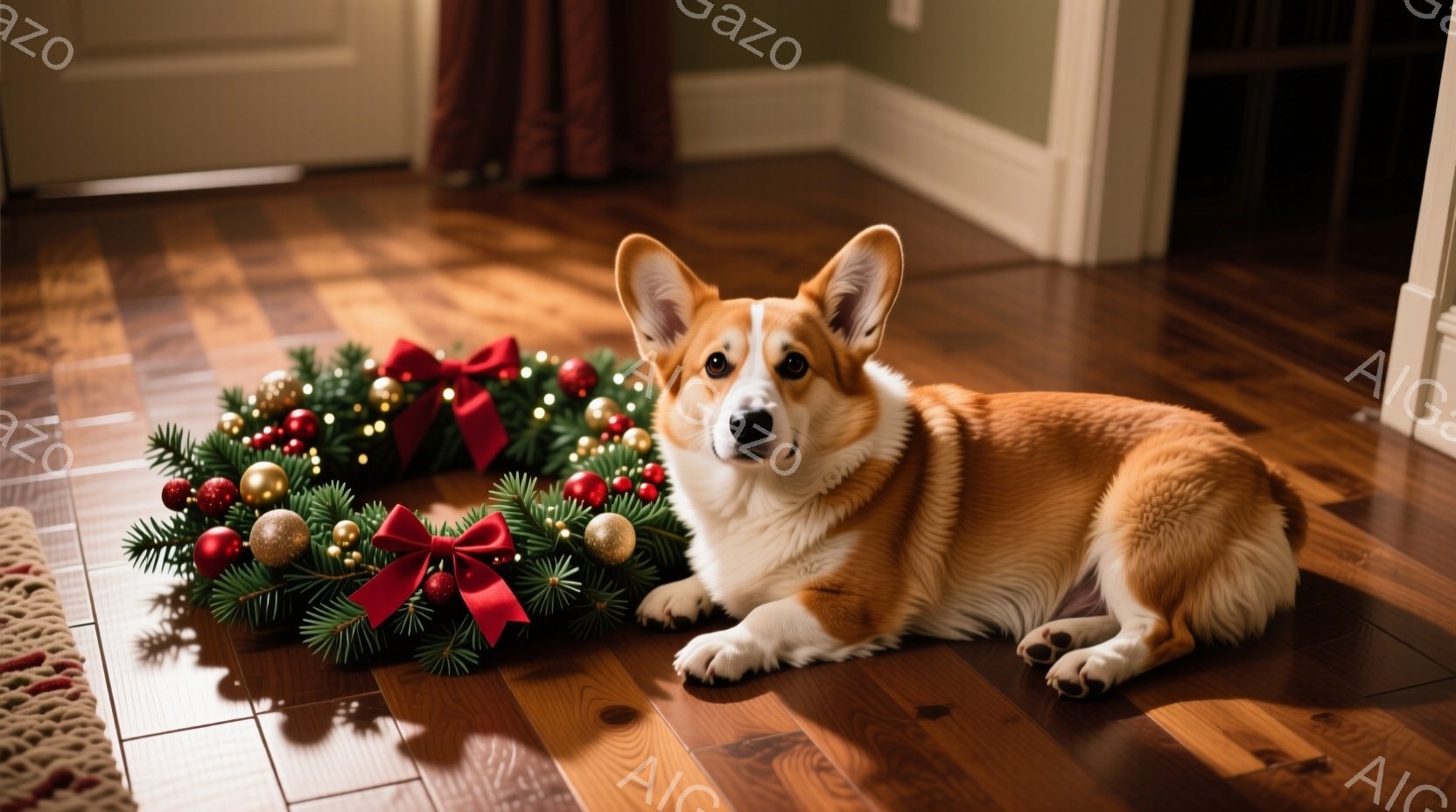 温かい光に照らされた木製の床に、コーギー犬が横たわっています。犬はリラックスした表情で、体の横にクリスマスリースが置かれています。背景には、飾り付けられたクリスマスツリーとプレゼントが見え、穏やかで心温まるクリスマスの雰囲気が漂っています。