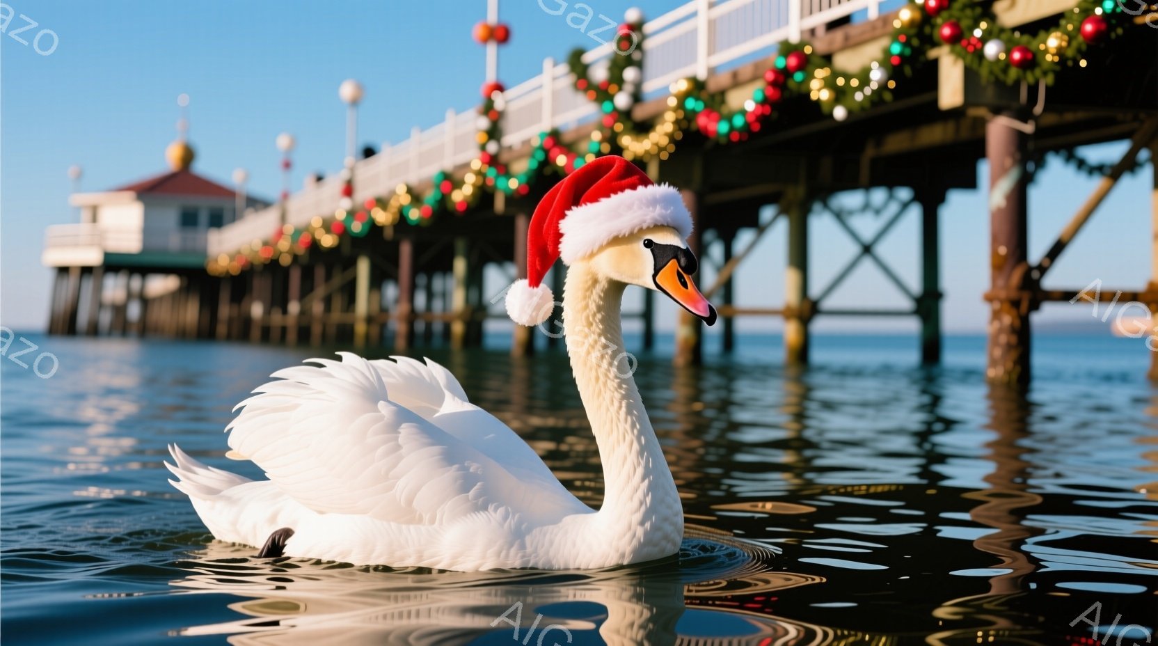 白い白鳥が水面を優雅に泳いでおり、頭には赤いサンタ帽が乗っています。背景には、カラフルな旗やイルミネーションで飾られた桟橋が見え、穏やかな水面には太陽の光が反射しています。全体的に、クリスマスの雰囲気を漂わせる、平和で楽しい光景です。