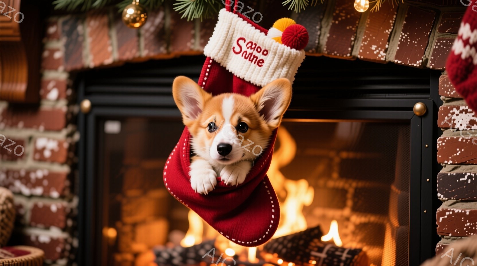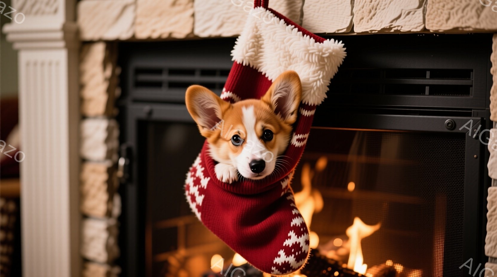 暖炉の赤いクリスマスストッキングの中から、コーギーの子犬が顔を出しています。子犬は白い胸と鼻を持ち、好奇心に満ちた表情でカメラを見つめています。背景には燃え盛る暖炉の炎とレンガ造りの壁があり、クリスマスの温かく居心地の良い雰囲気を醸し出しています。