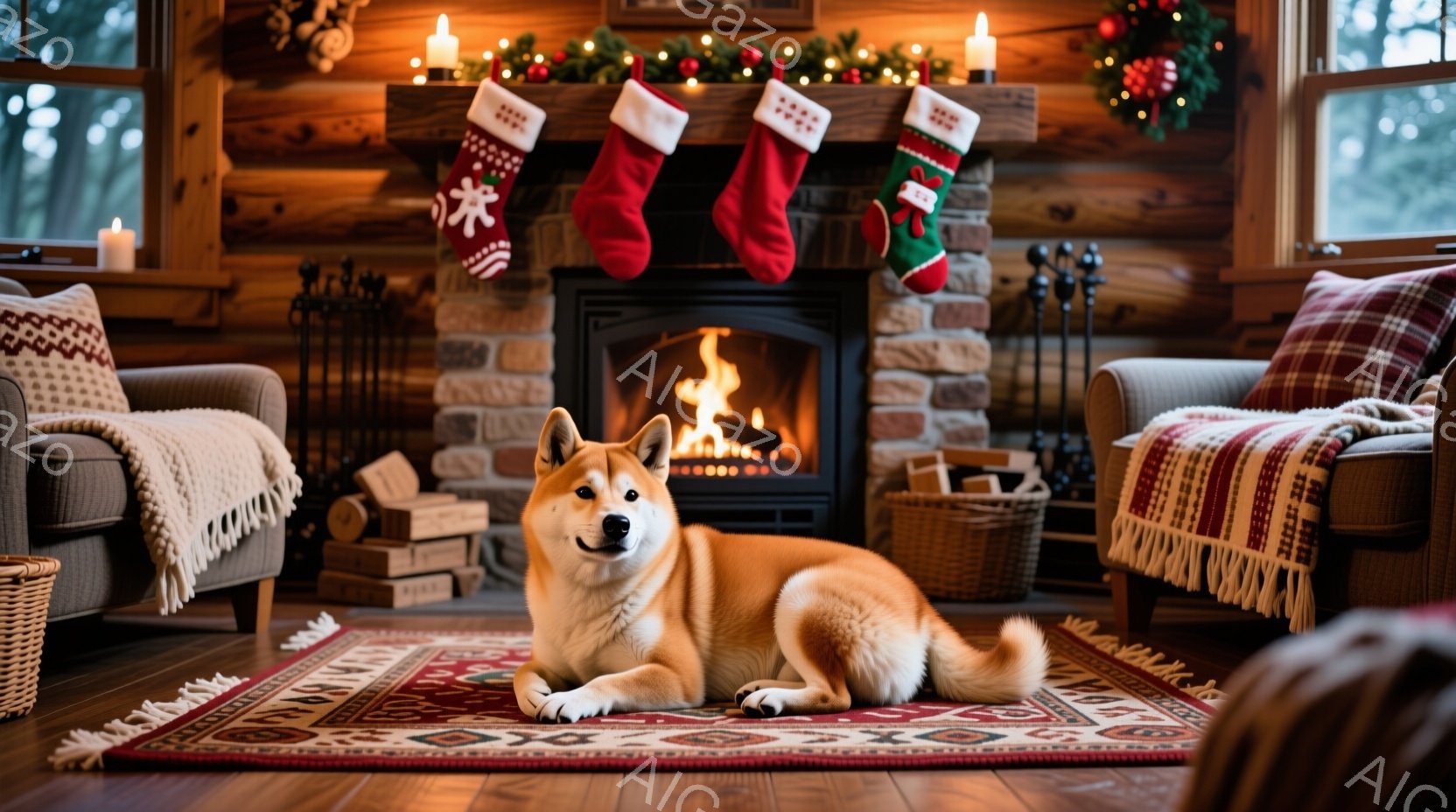 暖炉のある居間に柴犬が横たわっています。犬は首輪をつけ、穏やかな表情でカメラを見ており、その姿はリラックスしています。背景にはクリスマスデコレーションが施された暖炉、キリストマスの靴下、そして木のぬくもりを感じさせる内装が広がっています。