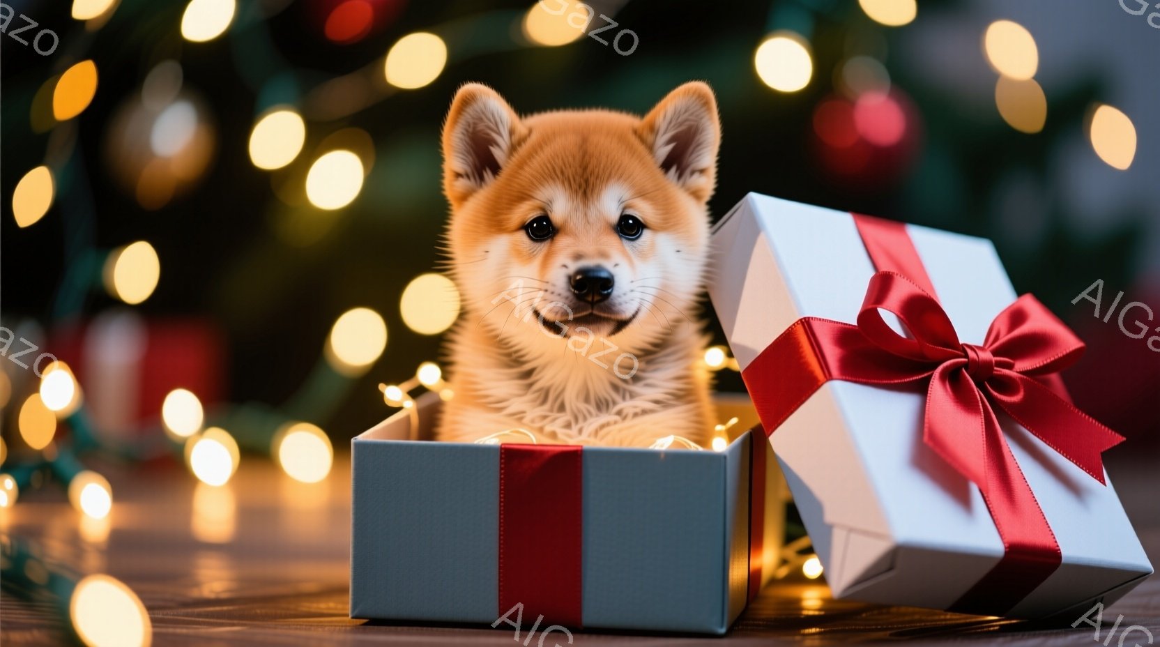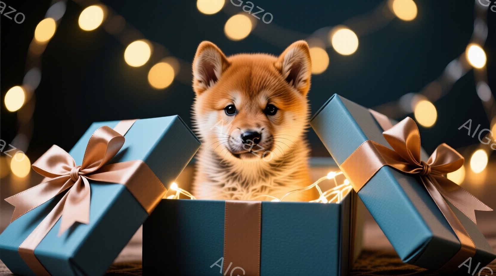 柴犬の子犬が、赤いリボンで飾られた白いギフトボックスとターコイズブルーのギフトボックスの中に座っています。子犬は正面を見ており、少し驚いたような、可愛らしい表情をしています。背景はぼやけた黄色の光で、お祝いやクリスマスのような雰囲気を作り出しています。