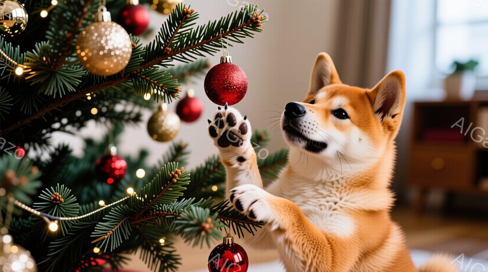 柴犬の子犬がクリスマスツリーの枝に手を伸ばし、赤いオーナメントを爪で軽く押さえています。毛並みは暖色系の茶色で、顔には楽しそうな表情が浮かんでいます。背景には緑色のツリーの葉や他のオーナメントが見え、温かく明るいクリスマスの雰囲気が漂っています。