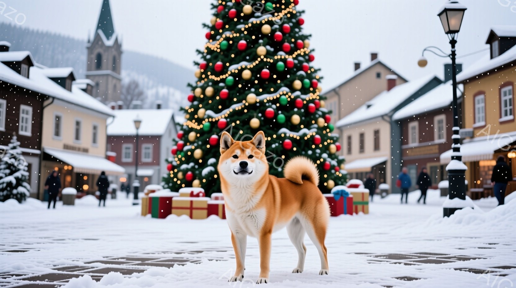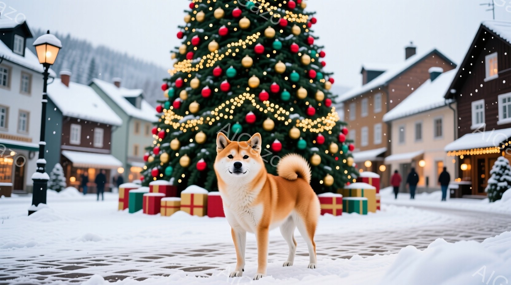 雪が降る広場に、柴犬が立っている。赤い首輪をつけており、自信に満ちた表情で正面を見つめている。背景にはクリスマスツリー、プレゼントの箱、雪景色の中の建物が見え、お祭り気分と冬の静けさが混ざり合った雰囲気が漂っている。