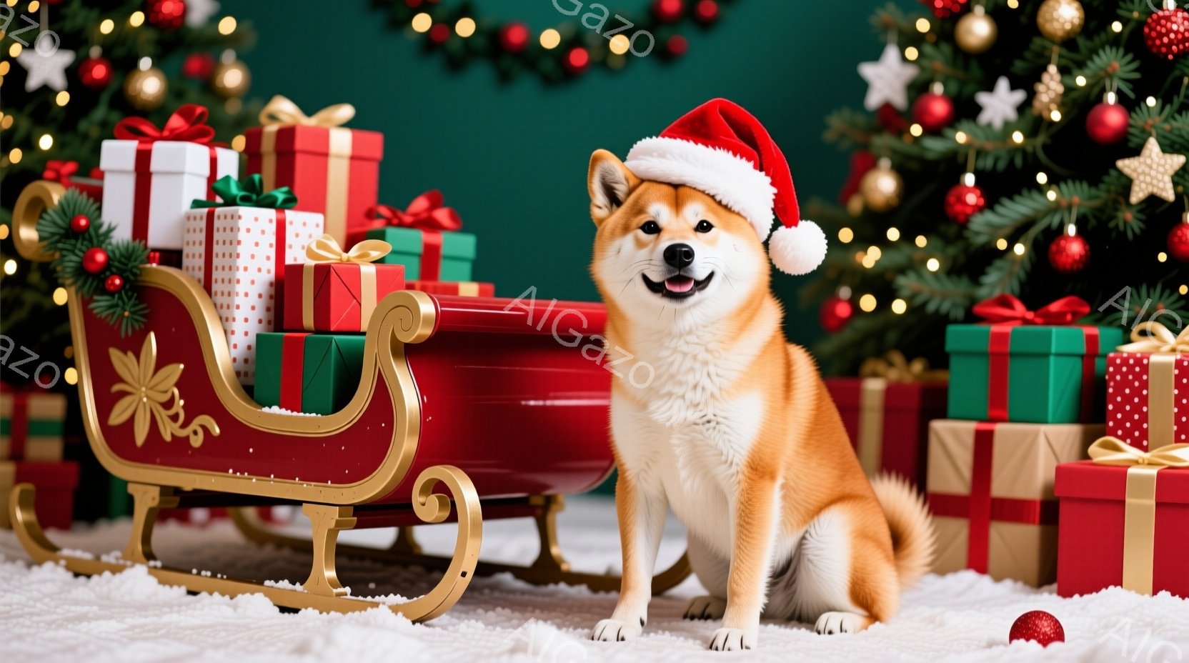 柴犬がサンタ帽をかぶり、雪の上に座っています。背景には、プレゼントが積み上げられた赤いそりが置かれ、緑色のクリスマスツリーが飾られています。全体的に温かく、お祝いムード満点の雰囲気です。