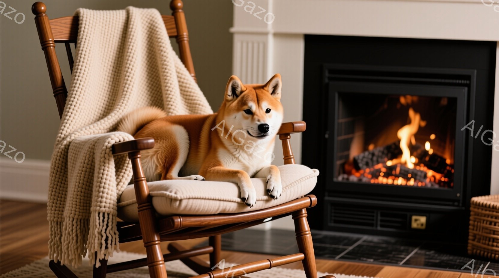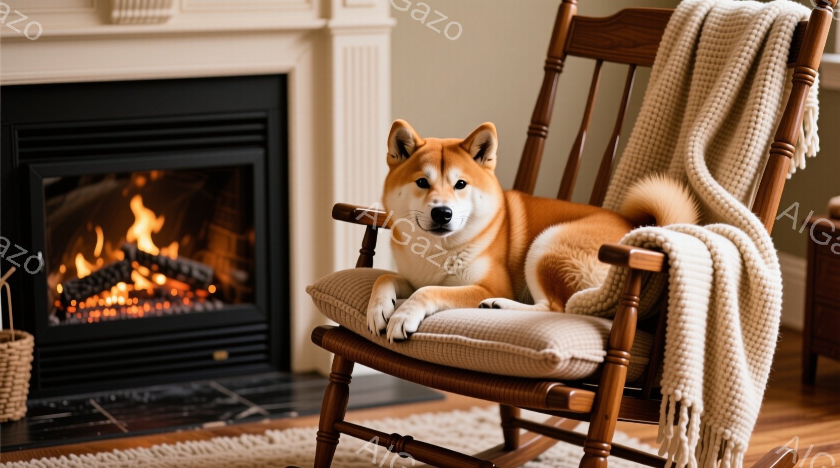 赤い柴犬がロッキングチェアにゆったりと腰掛けています。椅子にはオフホワイトのニットブランケットがかけられ、暖炉の炎が背景に見えます。部屋は落ち着いた色調で、暖かくリラックスした雰囲気が漂っています。