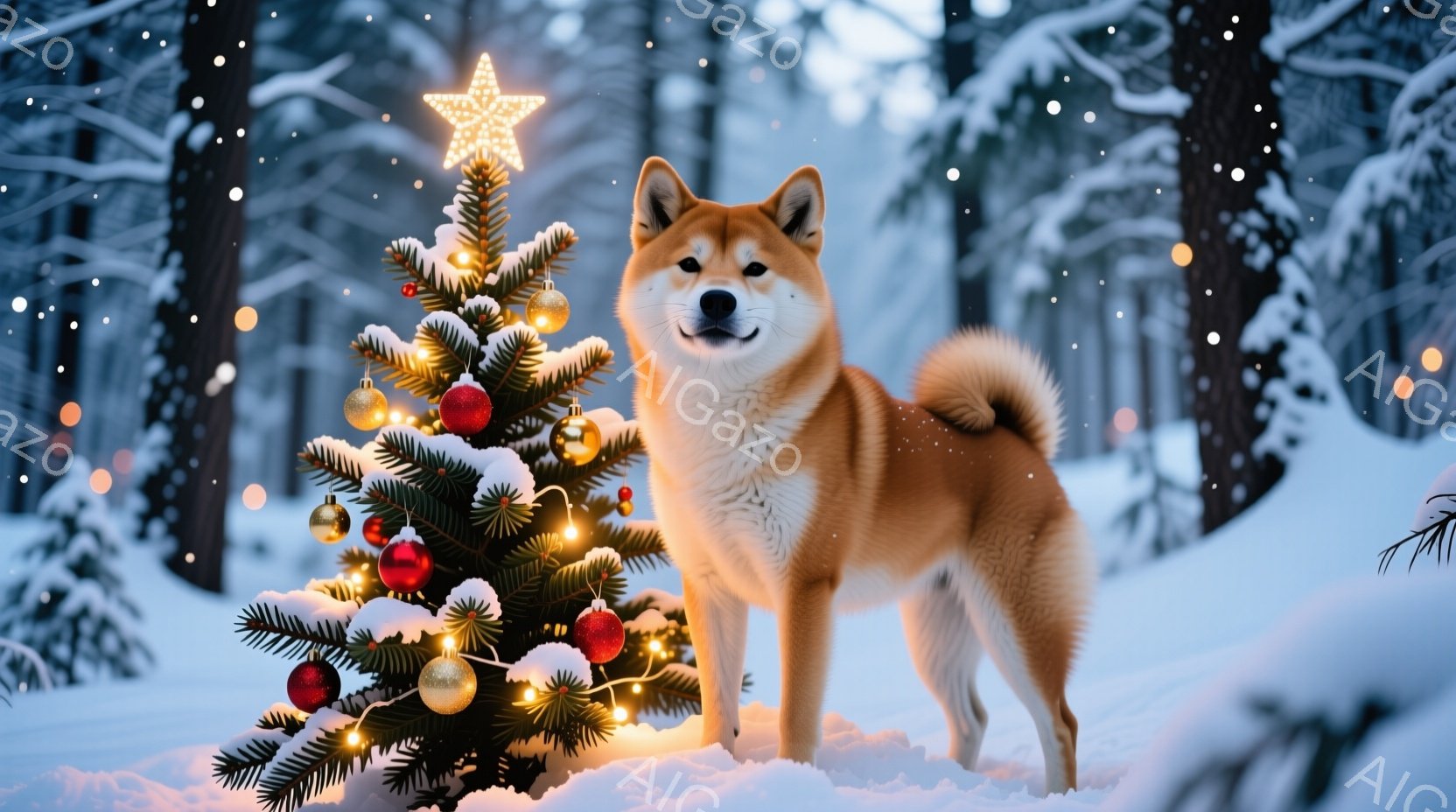 雪景色の中に飾られたクリスマスツリーの前に、柴犬が座っています。ツリーはオーナメントや電飾で美しく装飾され、犬は穏やかな表情でまっすぐ前を見つめています。背景は雪に覆われた木々で、全体的に暖かく、穏やかなクリスマスの雰囲気が漂っています。