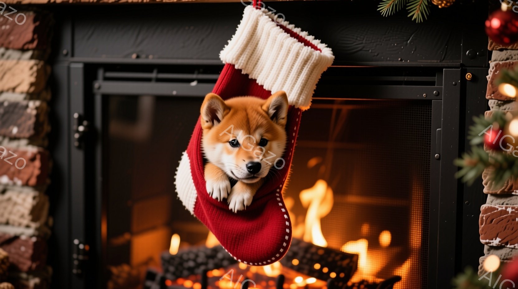 赤いクリスマスストッキングの中に、柴犬の子犬が可愛らしく顔を出しています。子犬は少し困ったような表情で、好奇心旺盛にこちらを見ています。背景にはレンガ造りの暖炉と、クリスマスの飾り付け、そして暖かく揺らめく炎が見え、温かく居心地の良い雰囲気が漂っています。