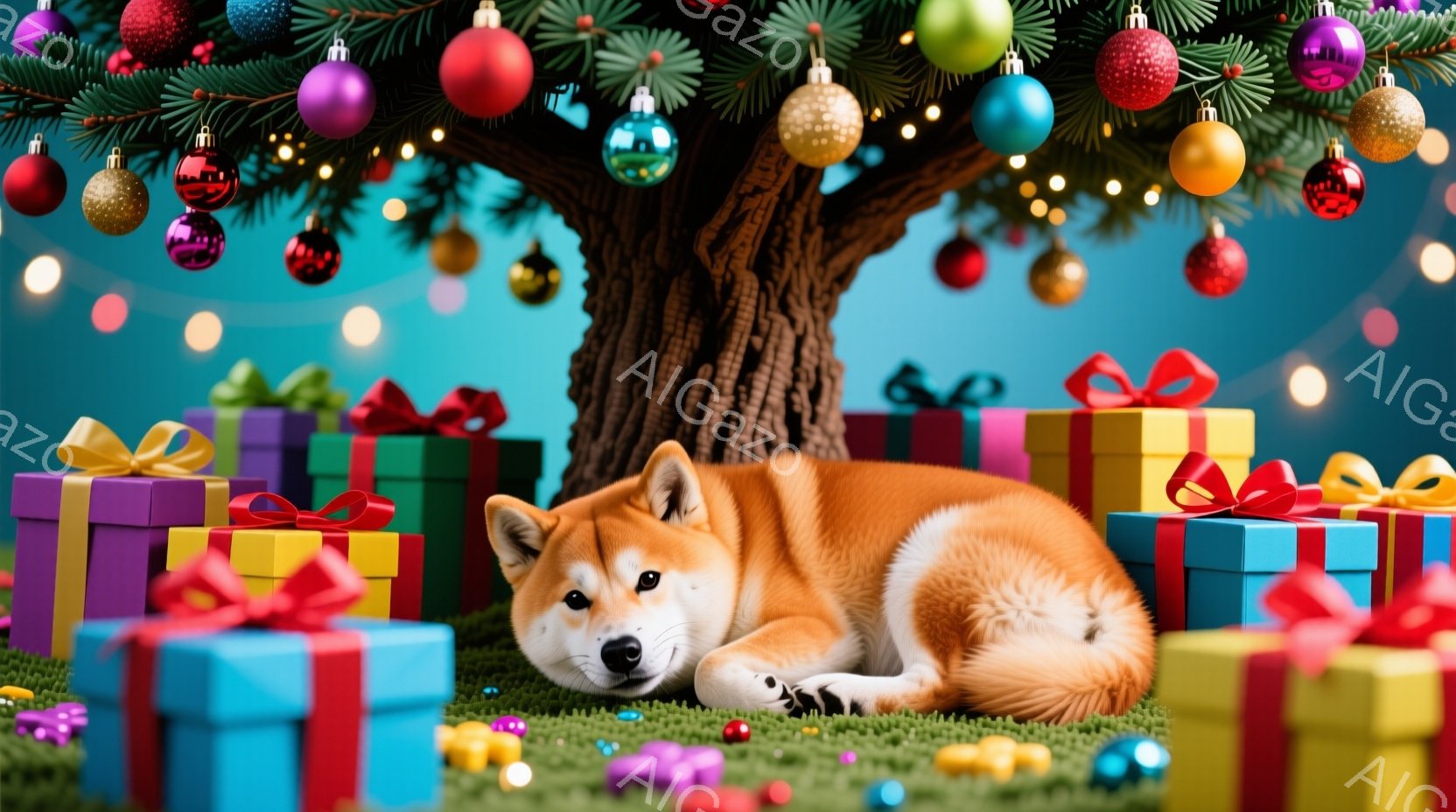 柴犬が雪に覆われた道に座っており、首には赤いリボンと葉っぱの飾りをつけている。背景にはクリスマスツリーや装飾が施された建物があり、雪が舞っている様子から冬の暖かい雰囲気が伝わってくる。灯篭の灯りが犬を照らし、穏やかで可愛らしい表情が印象的だ。