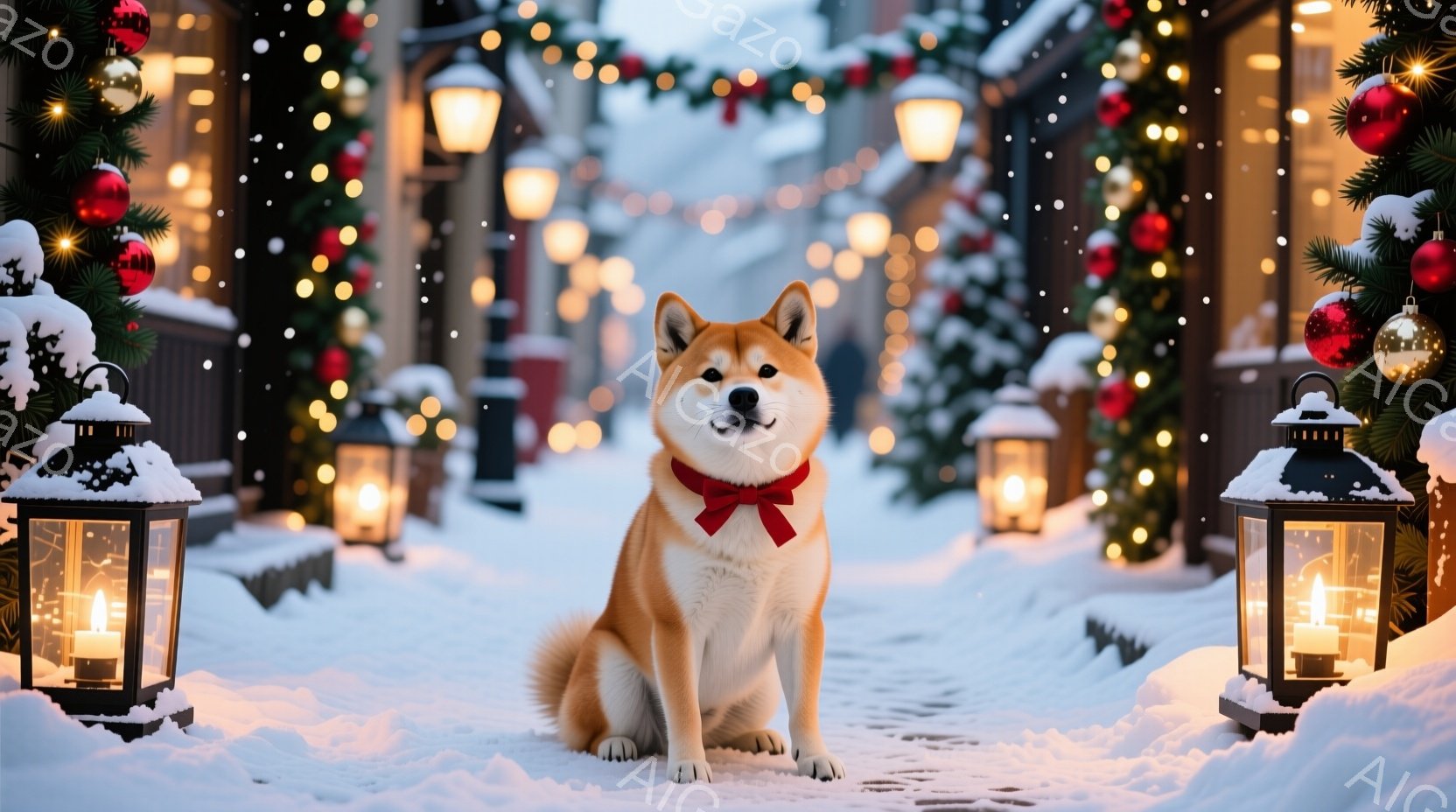 雪景色の中、柴犬がまっすぐ前を見て座っています。周囲にはクリスマスの飾り付けが施された街路があり、点灯されたランタンが暖かく照らしています。全体的に穏やかで、冬のホリデーシーズンらしい雰囲気です。