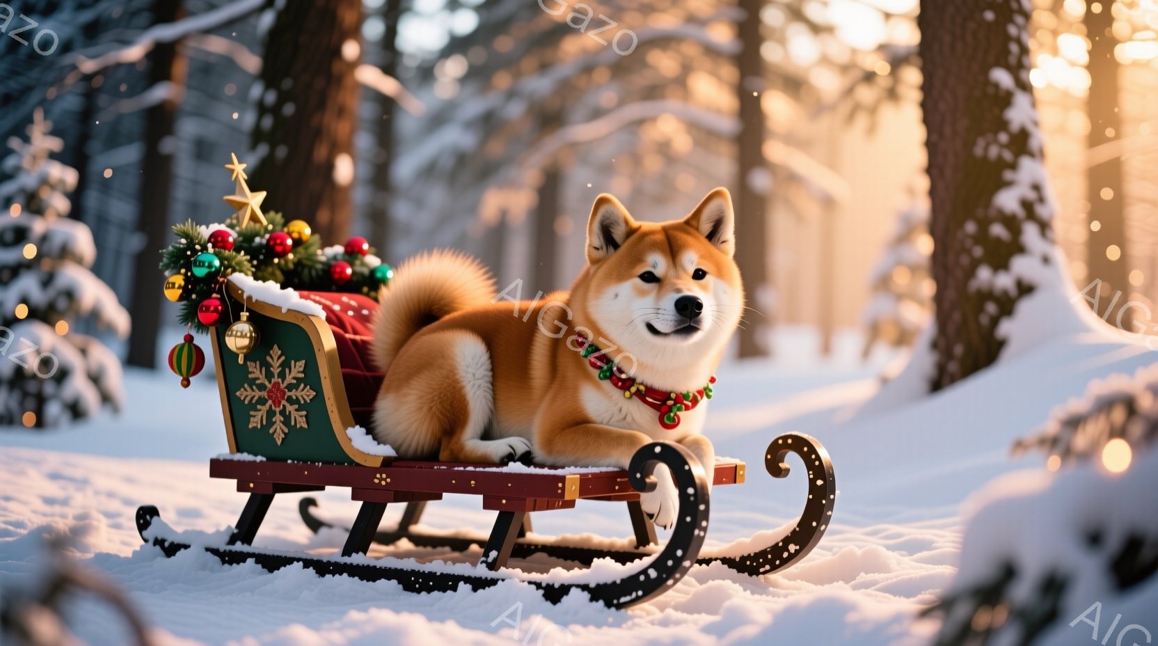 雪景色の中に、飾り付けられたそりが置かれており、そのそばで柴犬が横たわっています。柴犬は赤い首輪をつけており、穏やかな表情でこちらを見ています。背景には雪に覆われた木々が広がり、冬の静寂と暖かさが感じられる、魅力的な光景です。