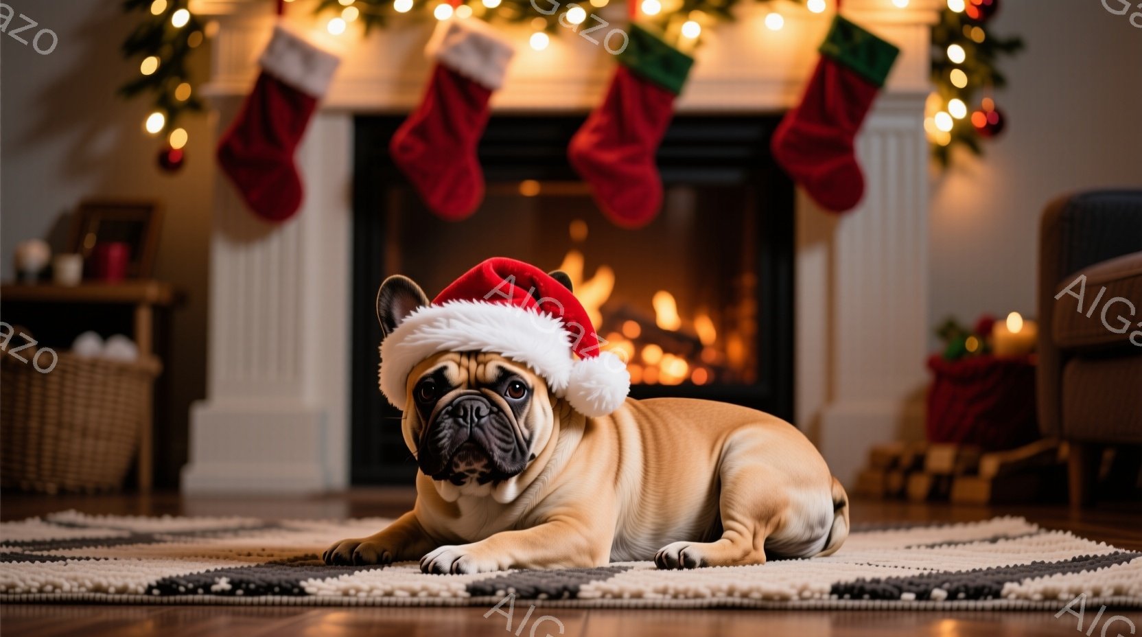 居心地の良い暖炉の前で、サンタの帽子をかぶった愛らしいフレンチブルドッグが横たわっています。犬はリラックスした表情で、床に敷かれたカラフルなラグの上にいます。背景にはクリスマスストッキングと点灯したキャンドルがあり、全体的に暖かく、お祝いムードに包まれています。