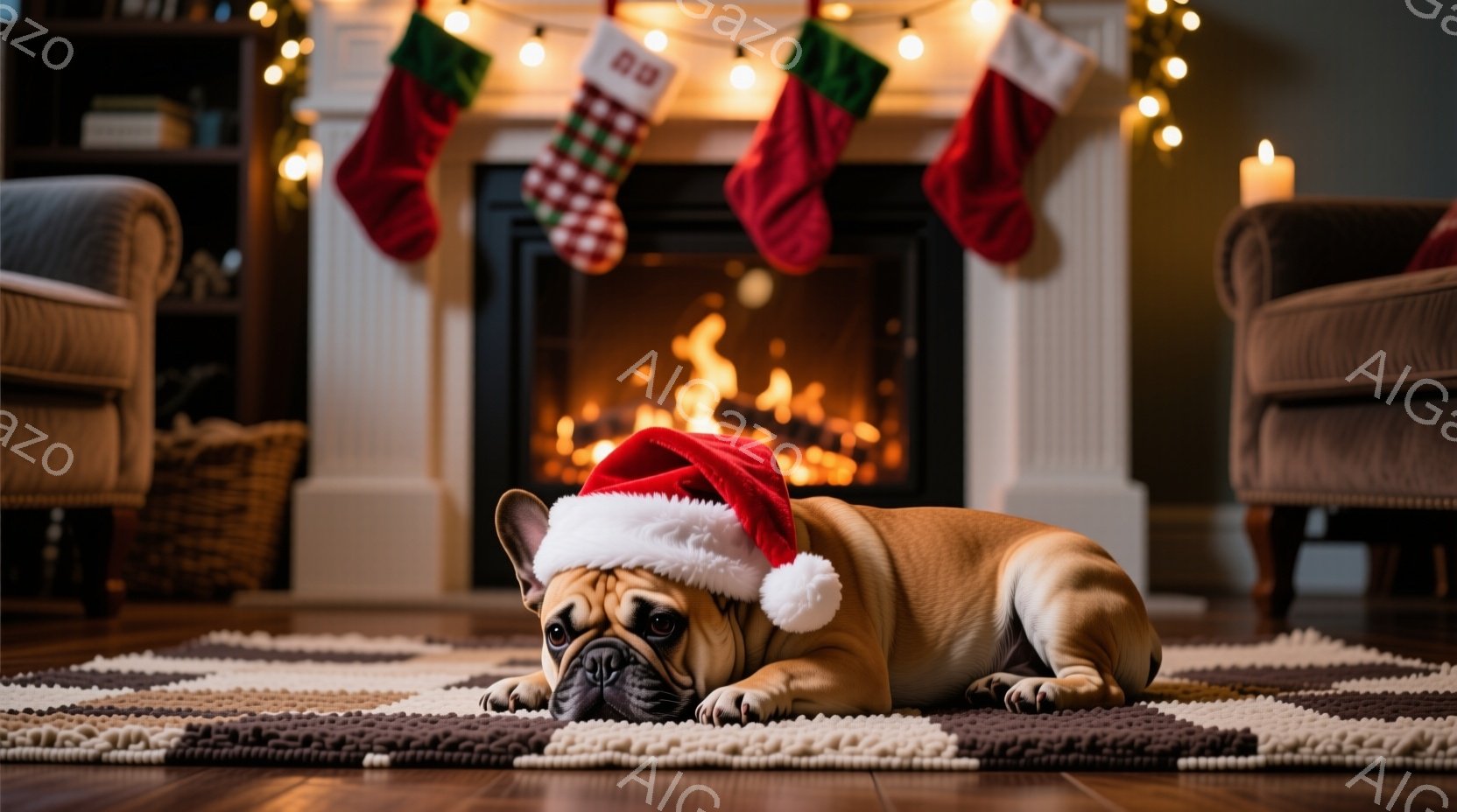 小さなフレンチブルドッグが青いギフトボックスの中に座っており、好奇心と少しの困惑が入り混じった表情で正面を見つめている。ギフトボックスの隣には、金色のリボンで飾られた別のギフトボックスがあり、背景には暖かくぼやけた光が散りばめられた、柔らかいカーペットが敷かれている。 全体的に、お祝いやプレゼントを連想させる、温かく可愛らしい雰囲気である。