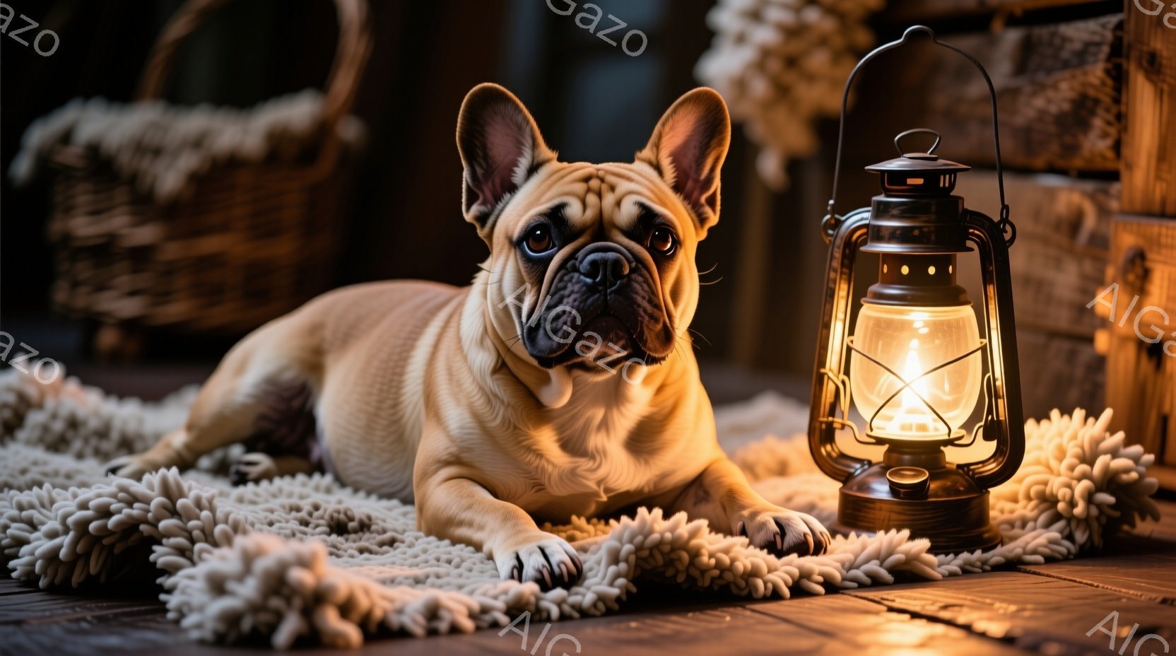 暖炉のある室内で、クリーム色のフレンチブルドッグがふわふわの白いラグの上に横たわっています。犬はカメラを見つめ、穏やかな表情をしています。背景には木製の箱、白い羊のぬいぐるみ、そして温かい光を放つランタンとイルミネーションがあり、リラックスした冬の雰囲気を感じさせます。