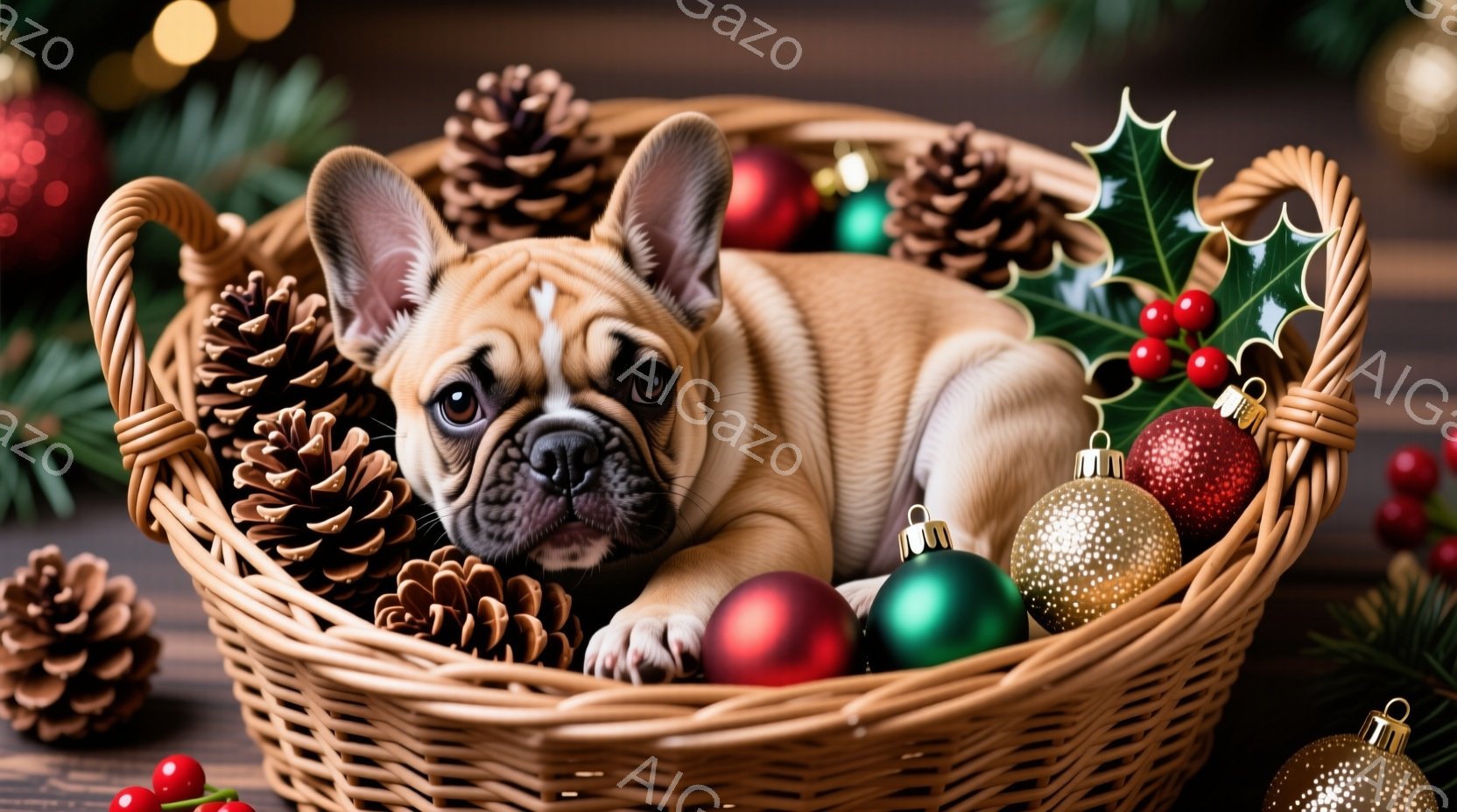 籐で編まれたバスケットの中に、クリーム色のフレンチブルドッグが丸まって眠っています。背景にはクリスマスツリーの飾りや松ぼっくりが配置され、温かく華やかなクリスマスの雰囲気を醸し出しています。犬の表情は穏やかで、リラックスした様子が伝わってきます。