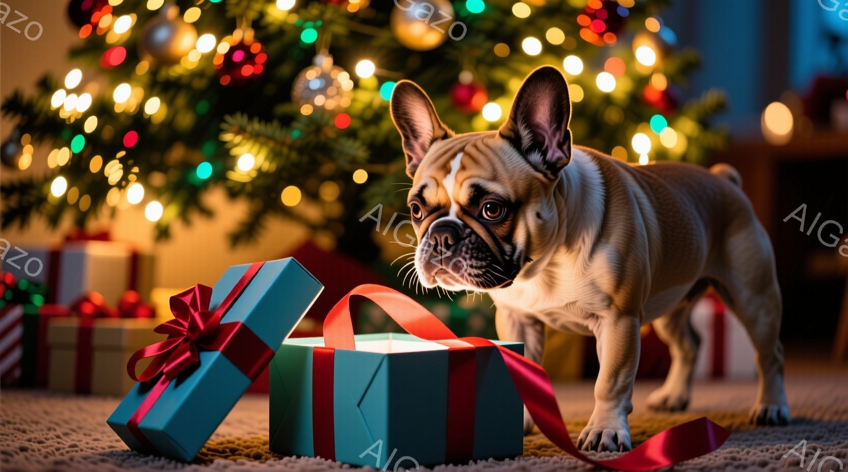 白と茶色のフレンチブルドッグが、赤いリボンと緑色の包装紙で飾られたプレゼントボックスに前足をかけて覗き込んでいます。背景には、色とりどりのオーナメントで飾られたクリスマスツリーがぼんやりと見え、温かく華やかなクリスマスの雰囲気が漂っています。カーペットの上に置かれたプレゼントボックスと、好奇心いっぱいの犬の表情が、喜びと期待感を表現しています。