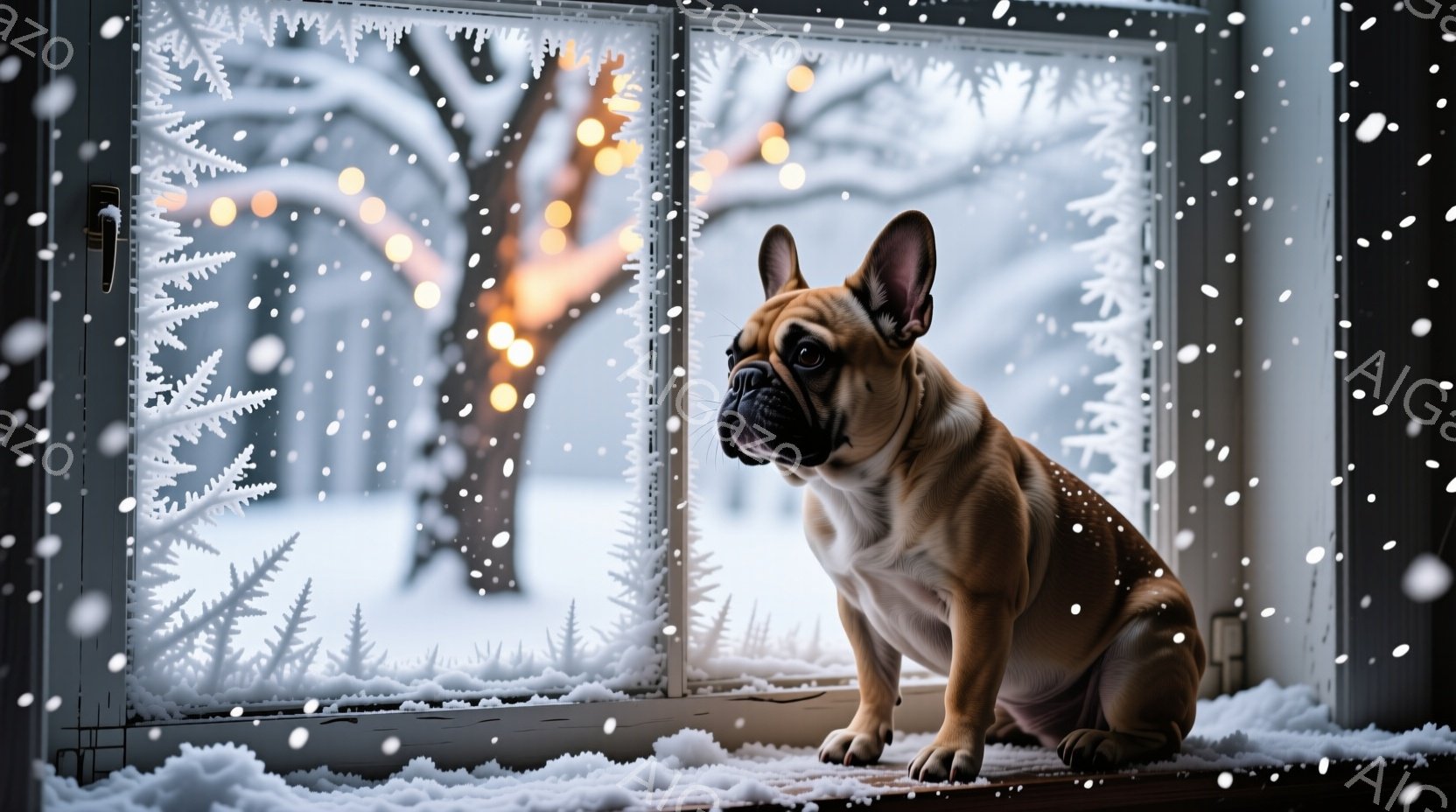 白い雪が窓枠に張り付き、クリスマスの飾り付けがぼんやりと見える背景に、愛らしいフレンチブルドッグが座っています。その表情はどこか物憂げで、遠くを見つめており、冬の静けさの中に暖かさと孤独感が混ざり合っています。雪景色と犬の姿が、落ち着いた冬の雰囲気を醸し出しています。