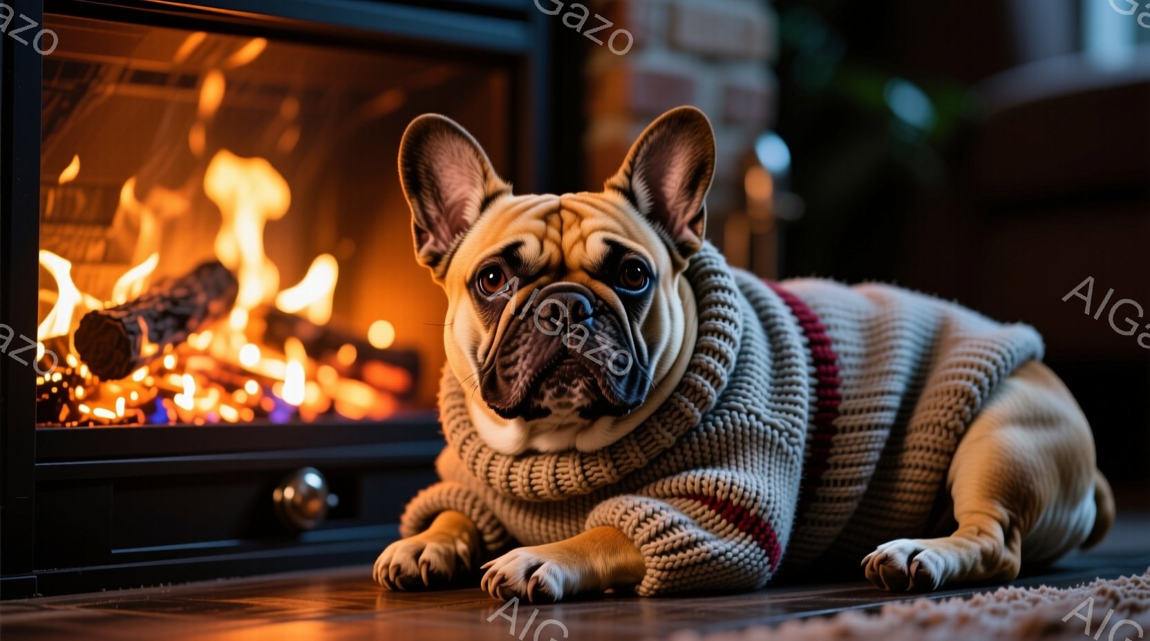 茶色のフレンチブルドッグが、白い縞模様のニットセーターを着て床に横たわっています。犬はカメラを見つめており、穏やかでリラックスした表情をしています。背景には暖炉があり、炎が燃えており、暖かい雰囲気を作り出しています。