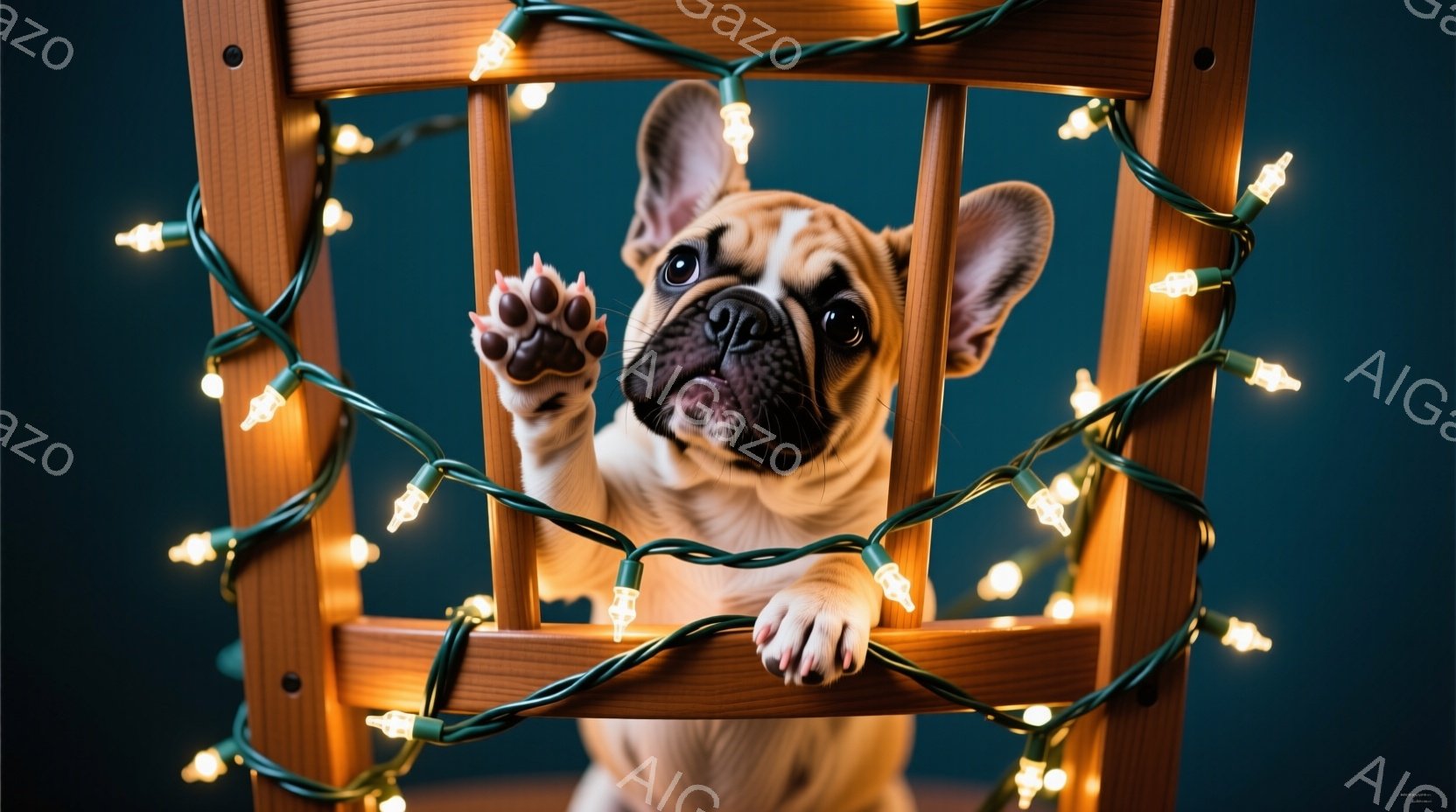 茶色のフランスブルドッグが、木製の椅子の隙間から顔を出し、前足で椅子に掴まっています。周囲には緑色のクリスマスライトが巻き付けられ、遊び心のある暖かい雰囲気を醸し出しています。背景は青色で、焦点は愛らしい犬にしっかりと当てられています。