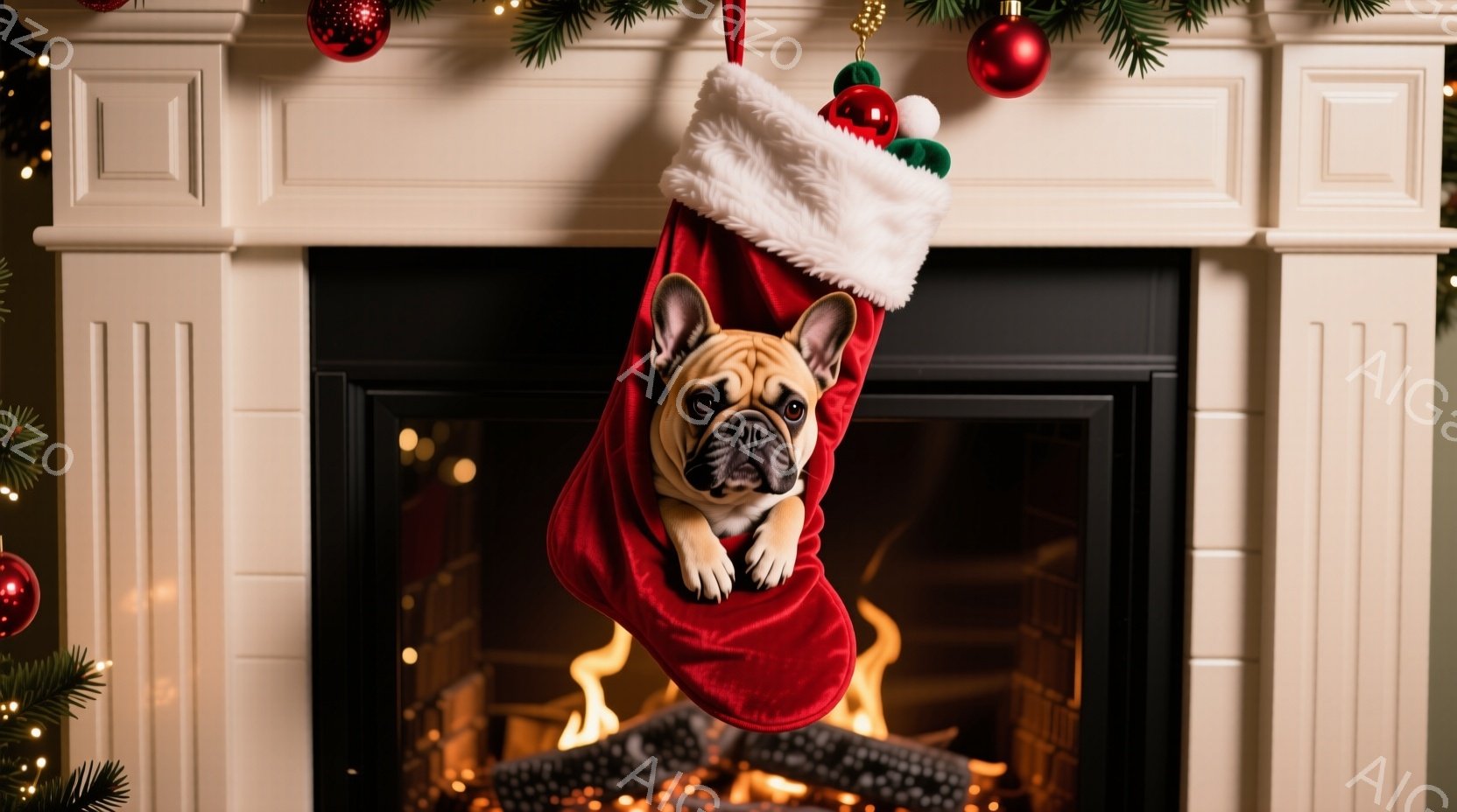 赤いクリスマスストッキングの中に、愛らしいフレンチブルドッグが顔を覗かせています。犬は少し困ったような表情で、クリスマスの暖炉の前でくつろいでいるようです。背景には暖炉の炎が燃え、ホリデーシーズンの温かく心地よい雰囲気を醸し出しています。