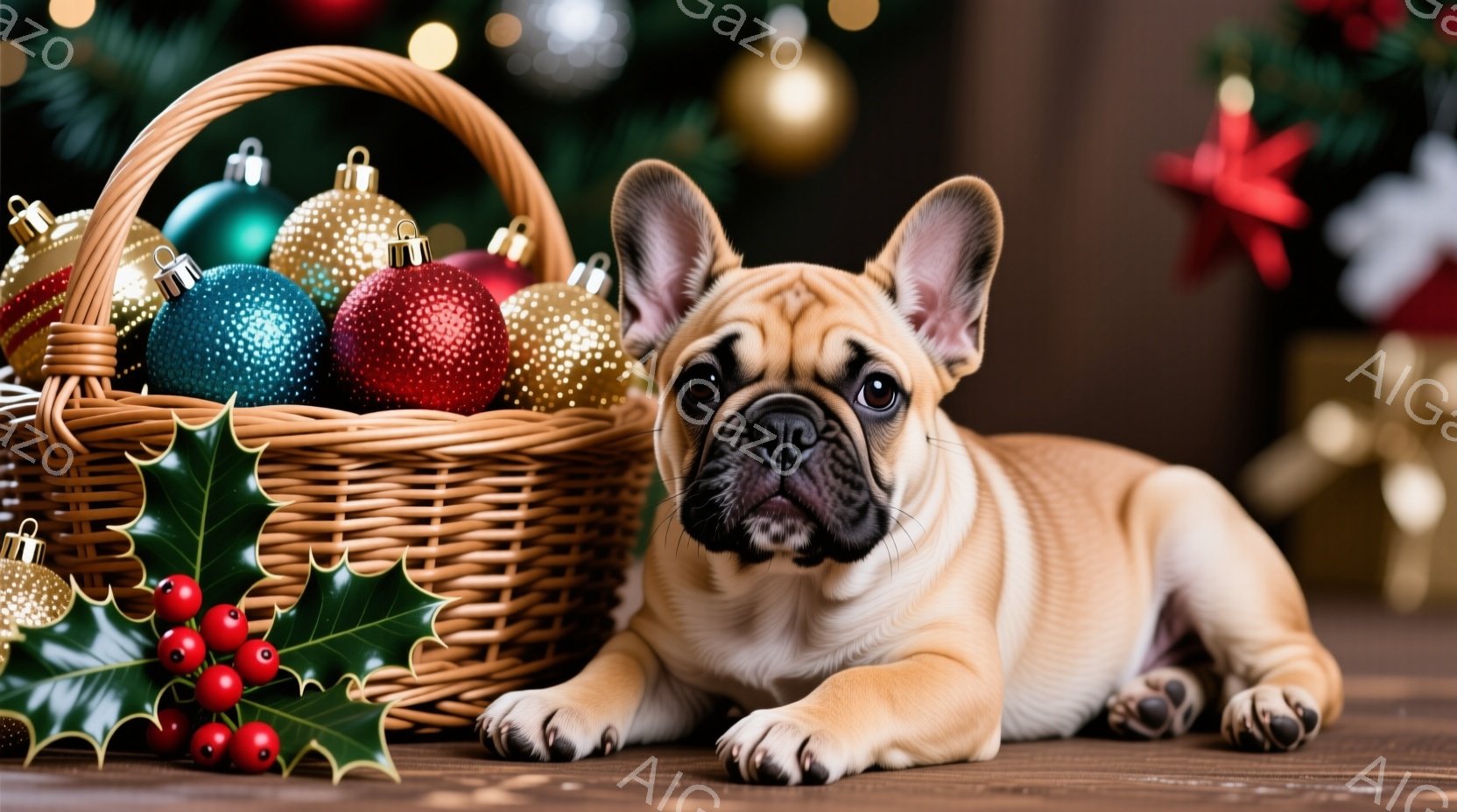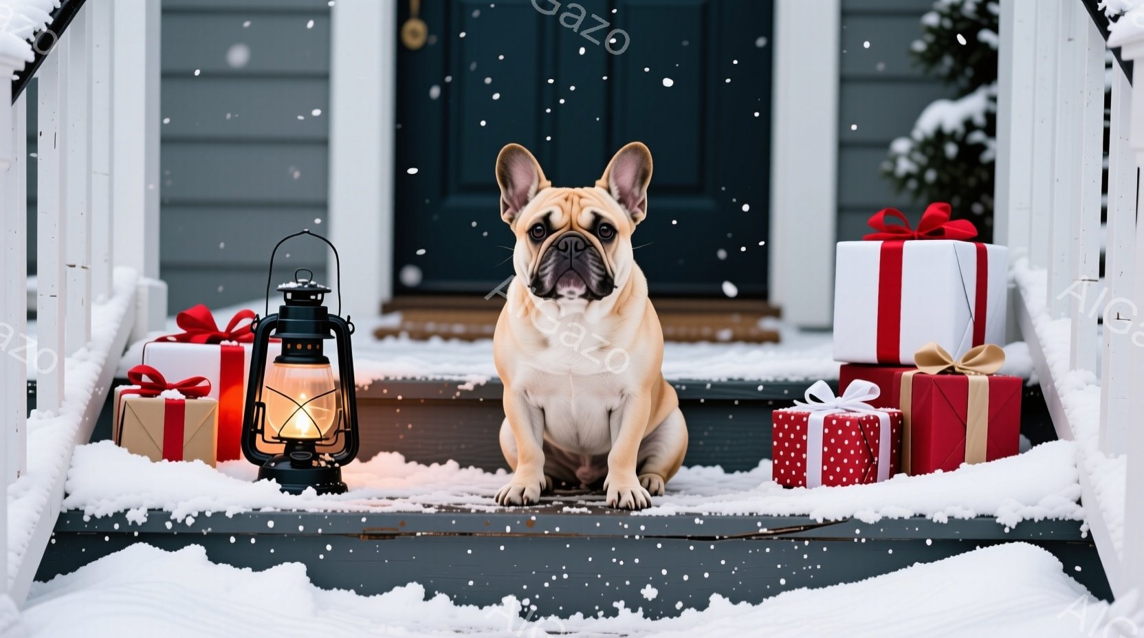 白い縁取りを持つクリーム色のフレンチブルドッグが、雪の積もった家のステップに座って正面を見つめている。ステップの周りにはプレゼントが置かれ、背景には暗緑色のドアと雪の積もった木々が見える。暖かい光を放つランタンが犬の横に置かれ、冬の祝祭の穏やかで心地よい雰囲気を醸し出している。