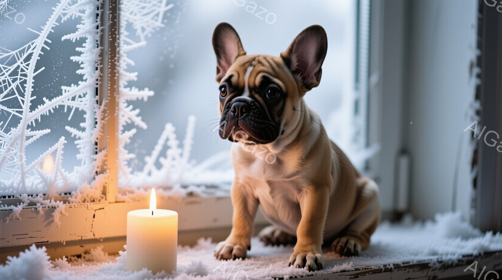 白い雪の結晶が窓に描かれ、その窓辺に明るく光るキャンドルが置かれています。ベージュ色のフレンチブルドッグがキャンドルの隣に座り、少し物憂げな表情で正面を見つめており、その毛並みは柔らかく、冬の暖かさを感じさせます。全体的に、静かで穏やかな冬の日の雰囲気が漂い、温かい光が犬の姿を優しく照らしています。