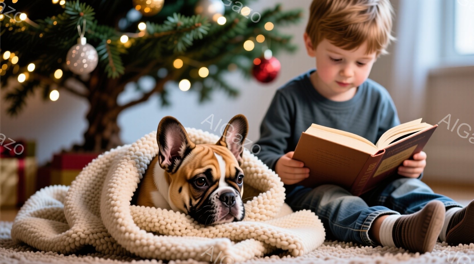 少年はニットのセーターとズボンを身につけ、足は裸足で、膝を曲げて柔らかい白い毛布に座っています。彼は本に集中して読み込んでおり、真剣な表情をしています。背景にはクリスマスツリーが光り輝き、暖かく、心地よい冬の雰囲気が漂っています。