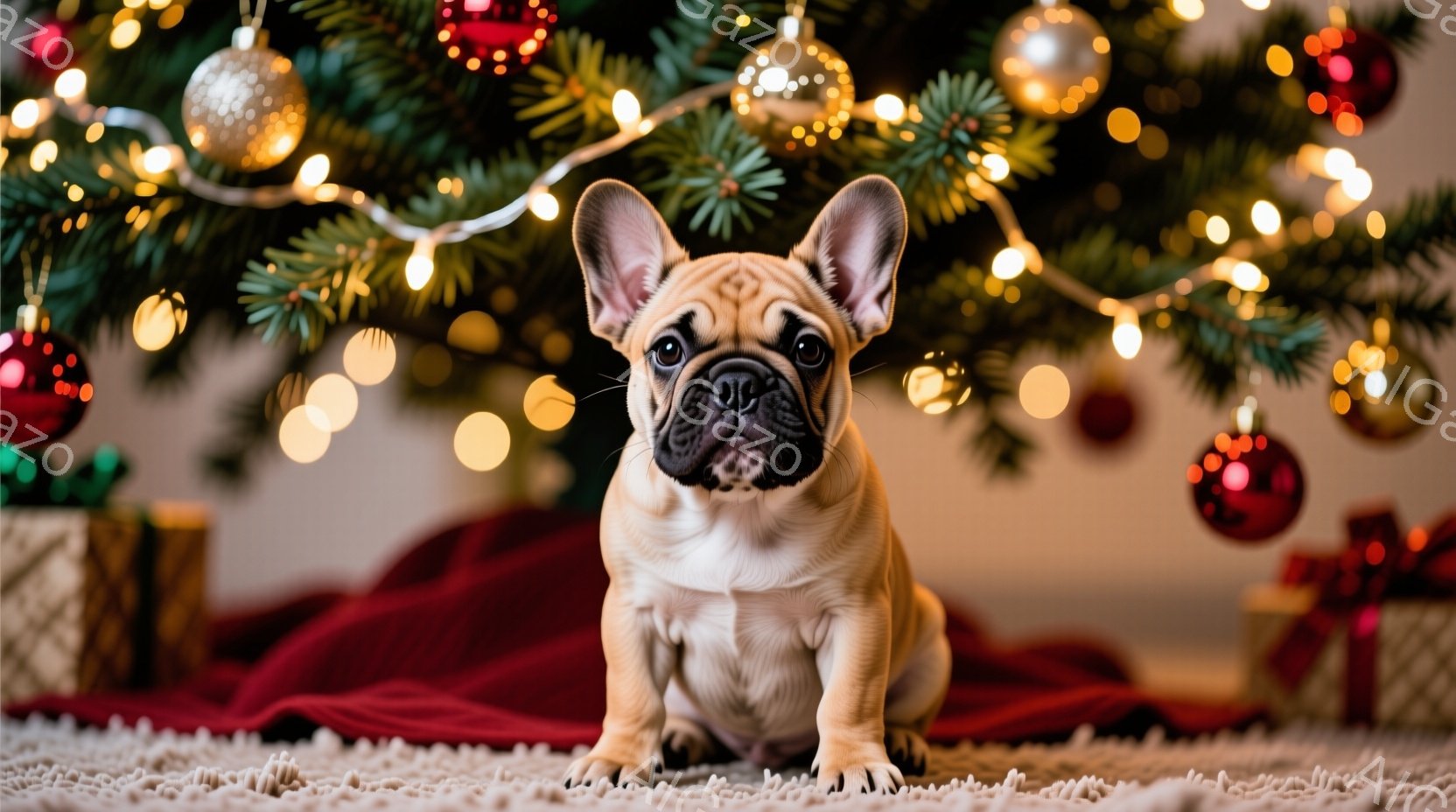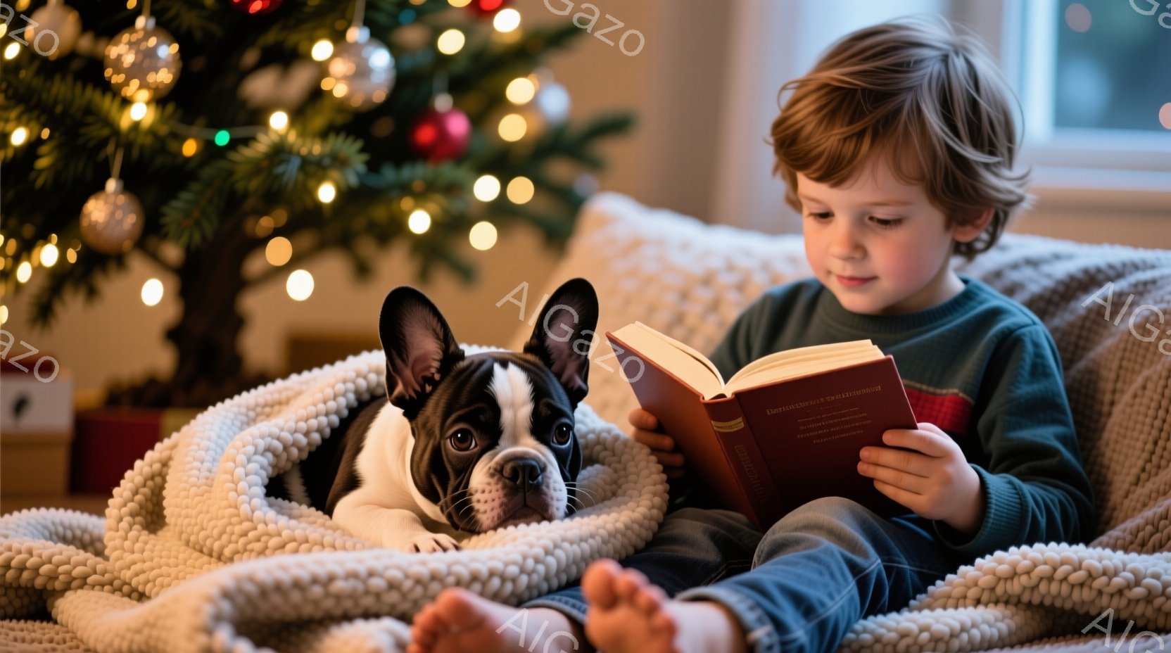 小さな少年が床に座り、膝の上に開いた本を読んでいます。少年は濃い青色の長袖シャツとグレーのズボンを着用し、茶色の髪をしています。背景には、飾り付けられたクリスマスツリーと、丸い白いブランケットに包まれたフレンチブルドッグが見え、暖かく心地よい雰囲気を醸し出しています。