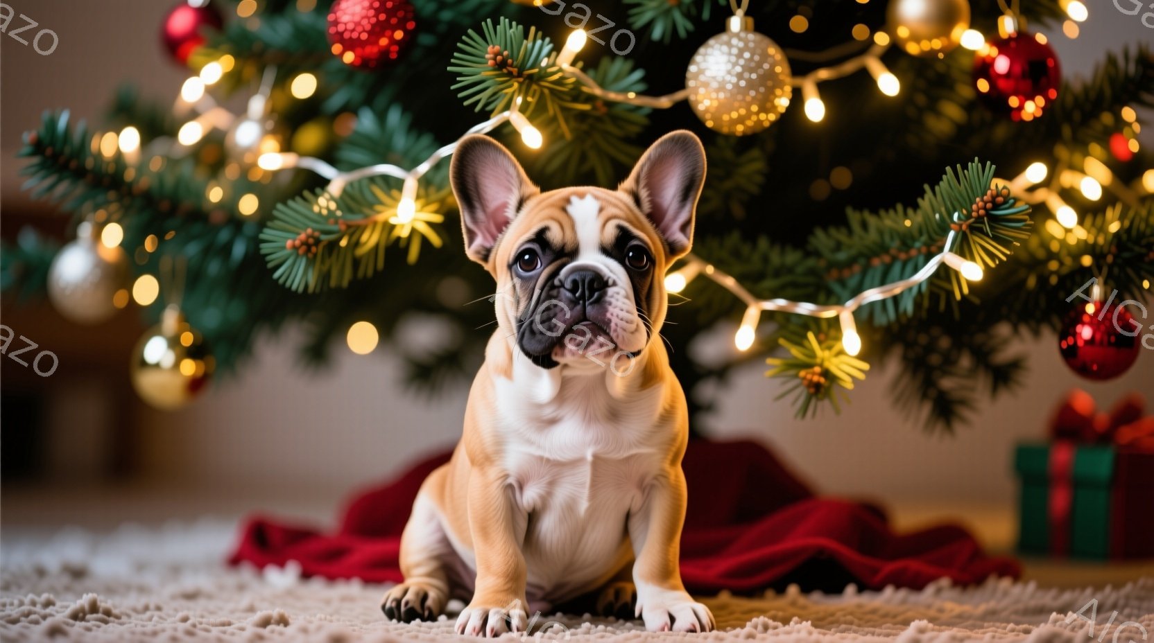 小さなクリーム色のフレンチブルドッグが、赤いベルベットの布とプレゼントボックスが置かれたカーペットの上に座っています。犬は正面を見つめており、好奇心と甘さにあふれた表情をしています。背景には、キラキラと輝くクリスマスツリーの飾りとライトがぼやけ、温かくお祝いムードに包まれた空間を表現しています。