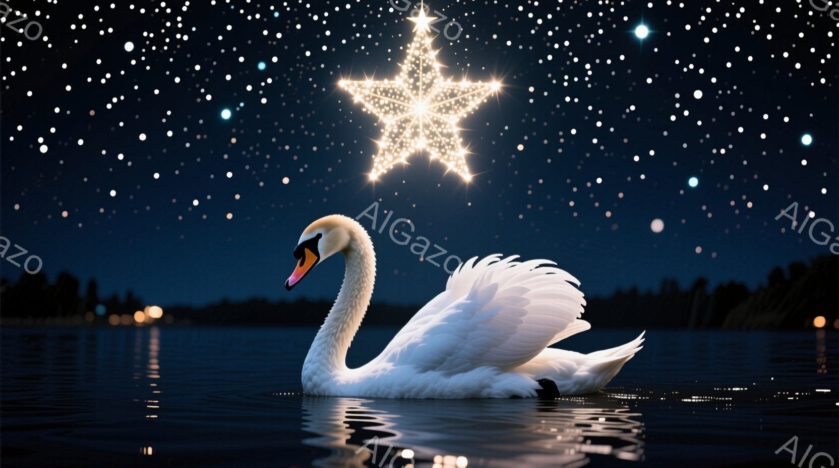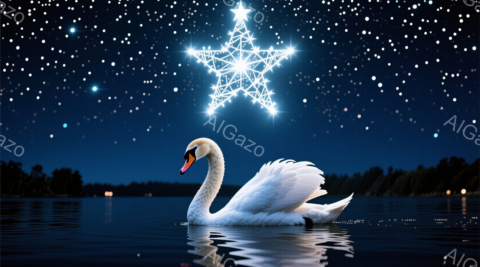 白い白鳥が静かな水面に浮かび、優雅に首を曲げています。背景は暗い夜空で、無数の星と輝く星型が夜空を彩り、水面には白鳥の姿が美しく映り込んでいます。全体的に穏やかで幻想的な雰囲気が漂い、夜空と白鳥のコントラストが印象的です。