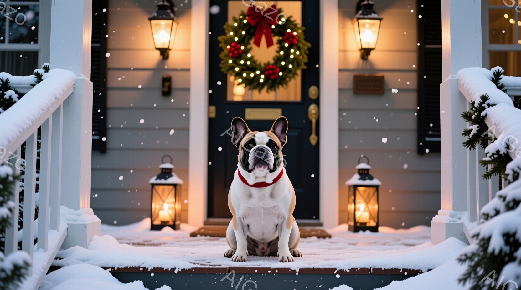 白いフレンチブルドッグが、雪で覆われた家の階段に座っています。赤い首輪をつけ、まっすぐ前を見つめており、どこか誇らしげな表情をしています。背景にはクリスマスリースが飾られた玄関ドアがあり、両脇には明かりが灯ったランタンが置かれ、雪が舞う冬の暖かい雰囲気を醸し出しています。