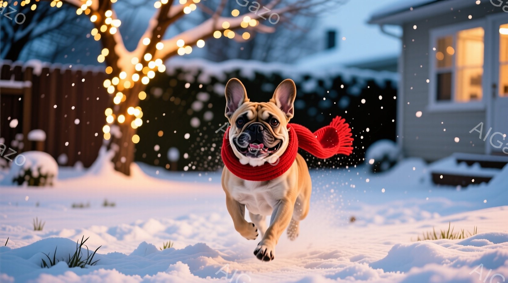 白い雪景色の中を、赤いマフラーを巻いたクリーム色のフレンチブルドッグが勢いよく駆けている。犬は口を開けて楽しそうに笑っており、その表情と躍動感あふれる姿勢が、冬の喜びを表現している。背景には薄暗い家々と輝くイルミネーションがあり、暖かく幸せなクリスマスの雰囲気を醸し出している。