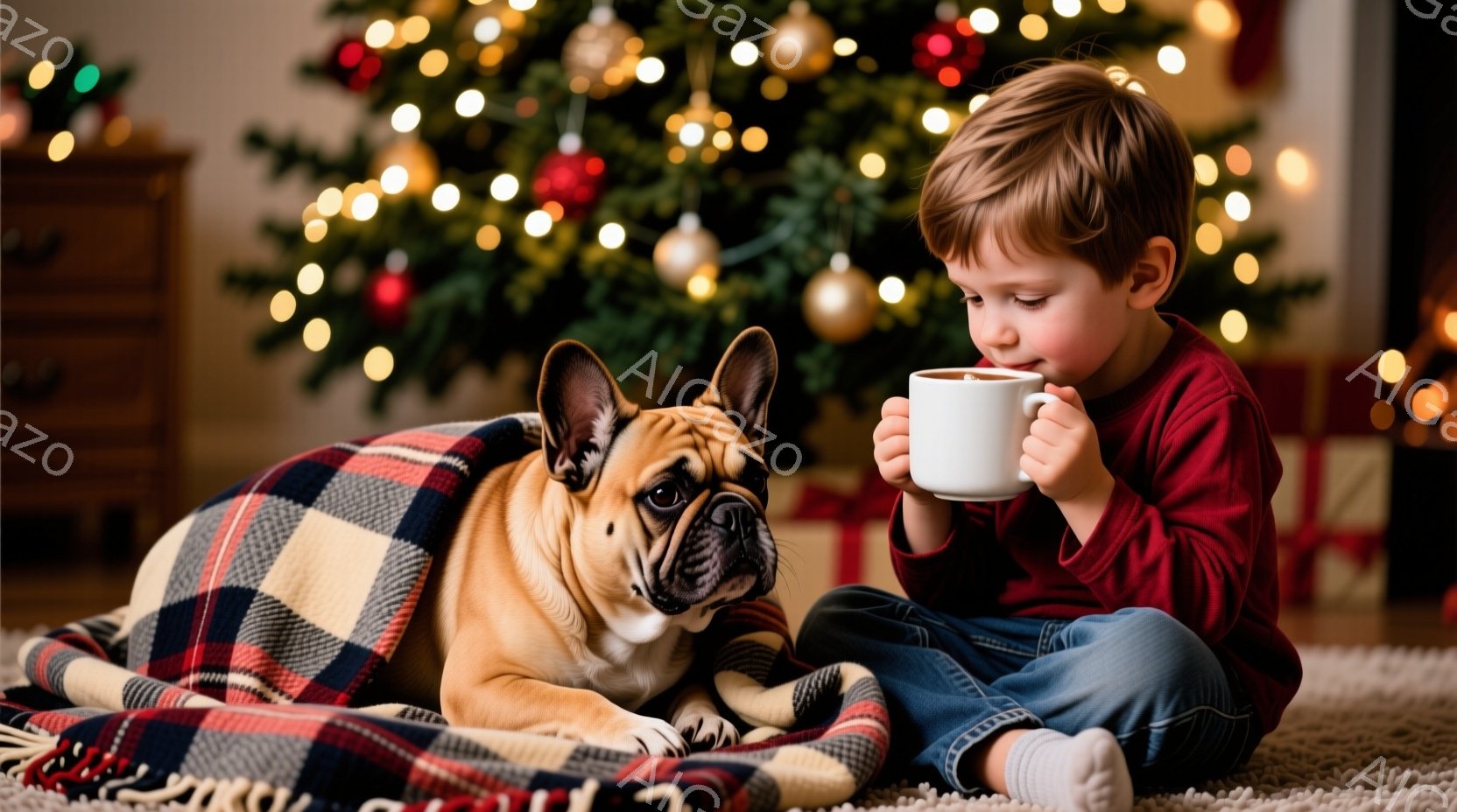 少年は青いジーンズと紺色のセーターを着て、白いマグカップを両手で抱え、微笑んでいます。フレンチブルドッグは、赤と青のチェック柄のブランケットの上に横たわり、カメラの方を見ています。背景にはクリスマスツリーが飾られ、暖かい雰囲気で、家庭的な幸せを感じさせます。