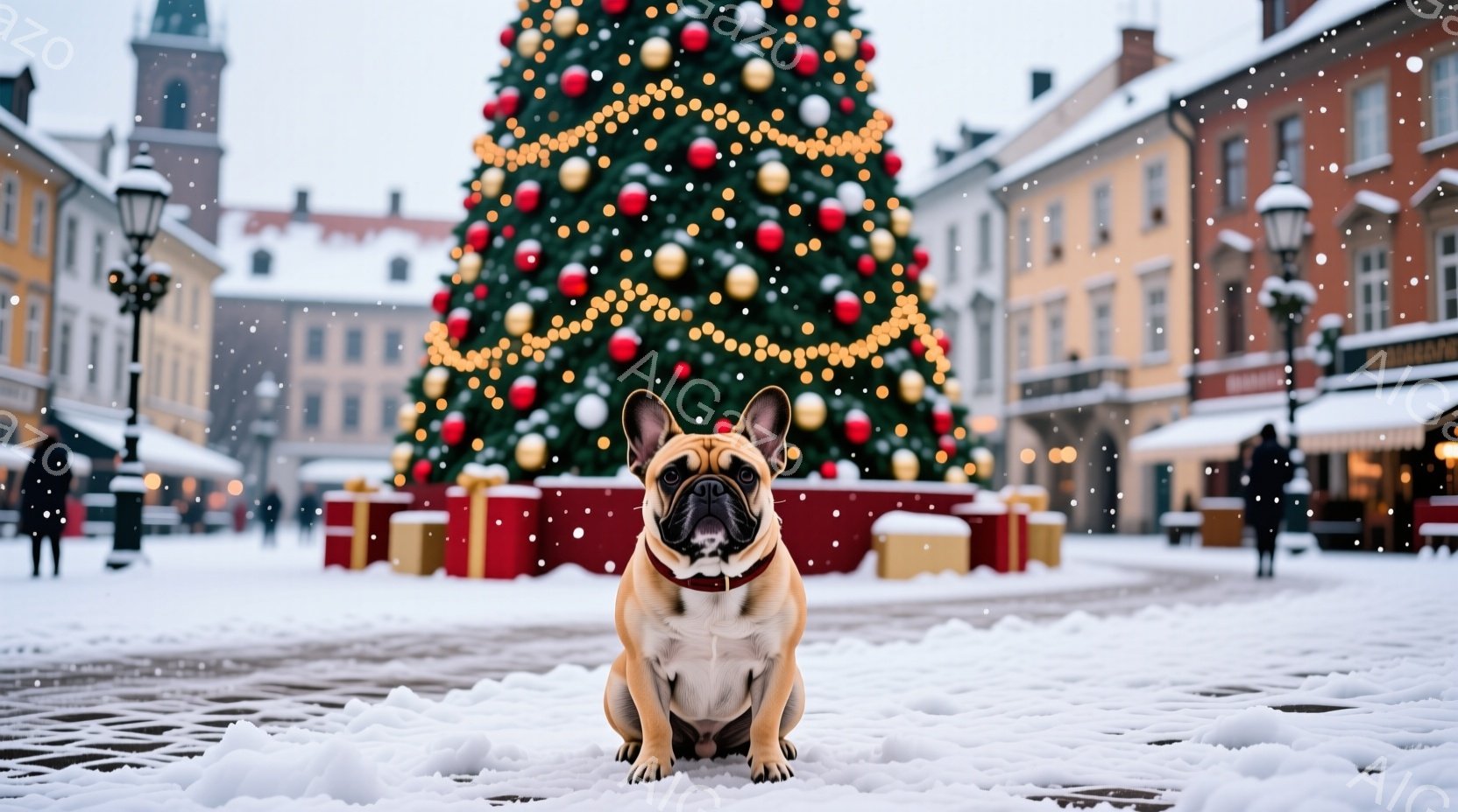 白い雪に覆われた広場に、愛らしいフレンチブルドッグが座っています。クリスマスツリーが背景にそびえ立ち、プレゼントボックスが並べられています。穏やかな雰囲気で、冬の温かい休日を象徴する、心温まる光景です。
