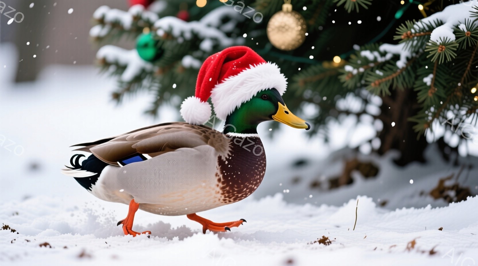 これは、雪景色の中でサンタ帽を被ったオスのマガモです。彼は雪の上を歩いており、顔は真剣な表情をしています。背景には、クリスマスオーナメントで飾られた緑の木があり、雪が舞い散る冬の雰囲気を作り出しています。