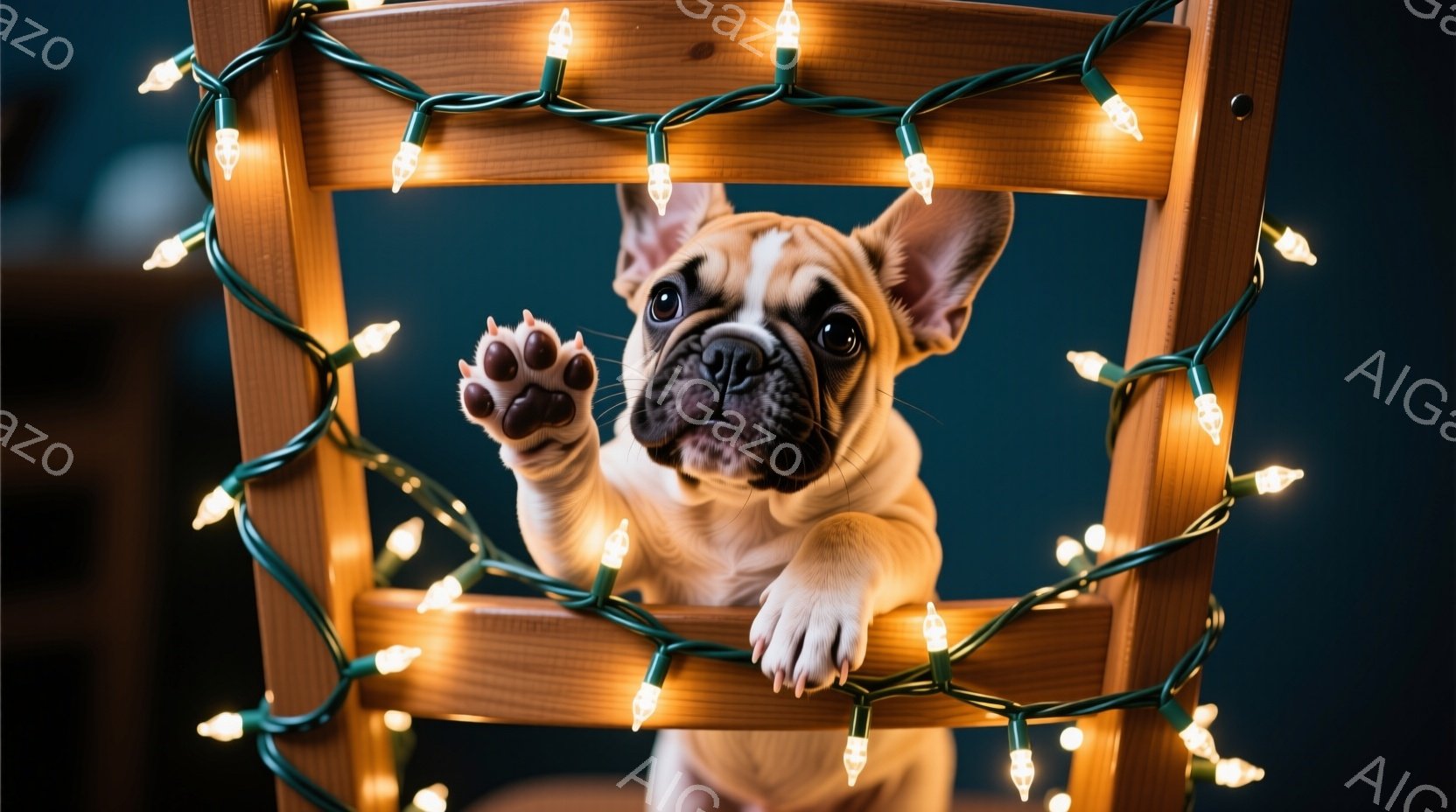 椅子に巻き付いたオレンジ色の電飾ライトに囲まれた、白い毛並みのフレンチブルドッグが写っています。犬は前足を上げて椅子越しにこちらを見ており、少しいたずらっぽい表情を浮かべています。背景は暗く、焦点は犬と椅子に合わされており、温かく遊び心のある雰囲気を醸し出しています。