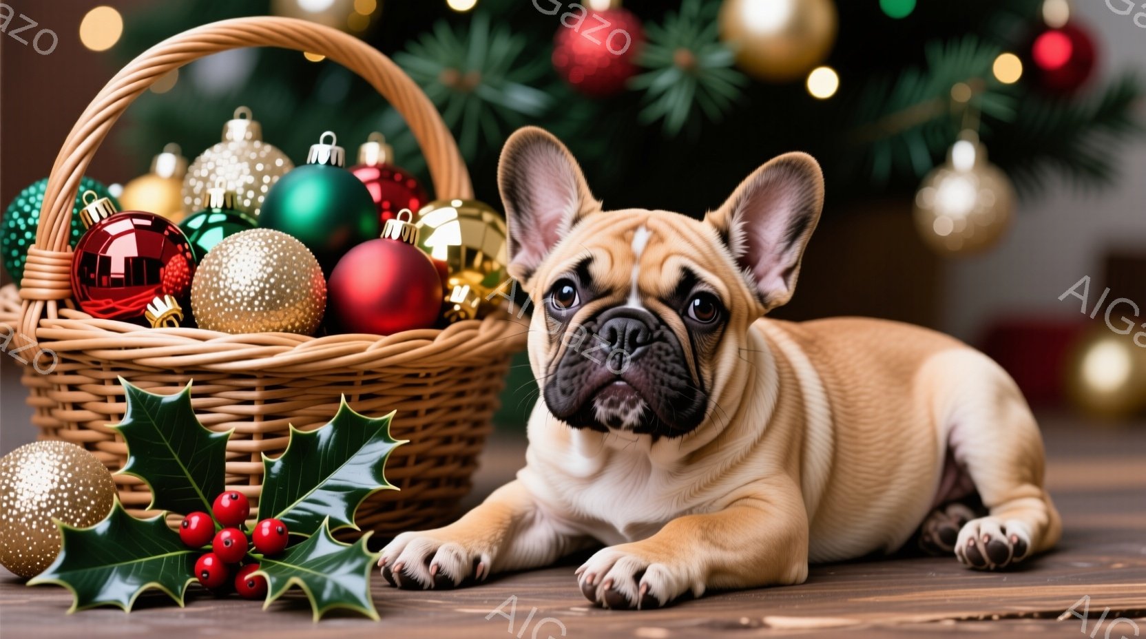 クリーム色のフロアに籐製のバスケットと、その中に赤い、金色の、緑色のクリスマスオーナメントが置かれています。バスケットの横には、愛らしい子犬が横たわり、正面を見てカメラに向かって穏やかな表情を浮かべています。背景には、ぼやけたクリスマスツリーの光が輝き、暖かくお祝いムードを醸し出しています。