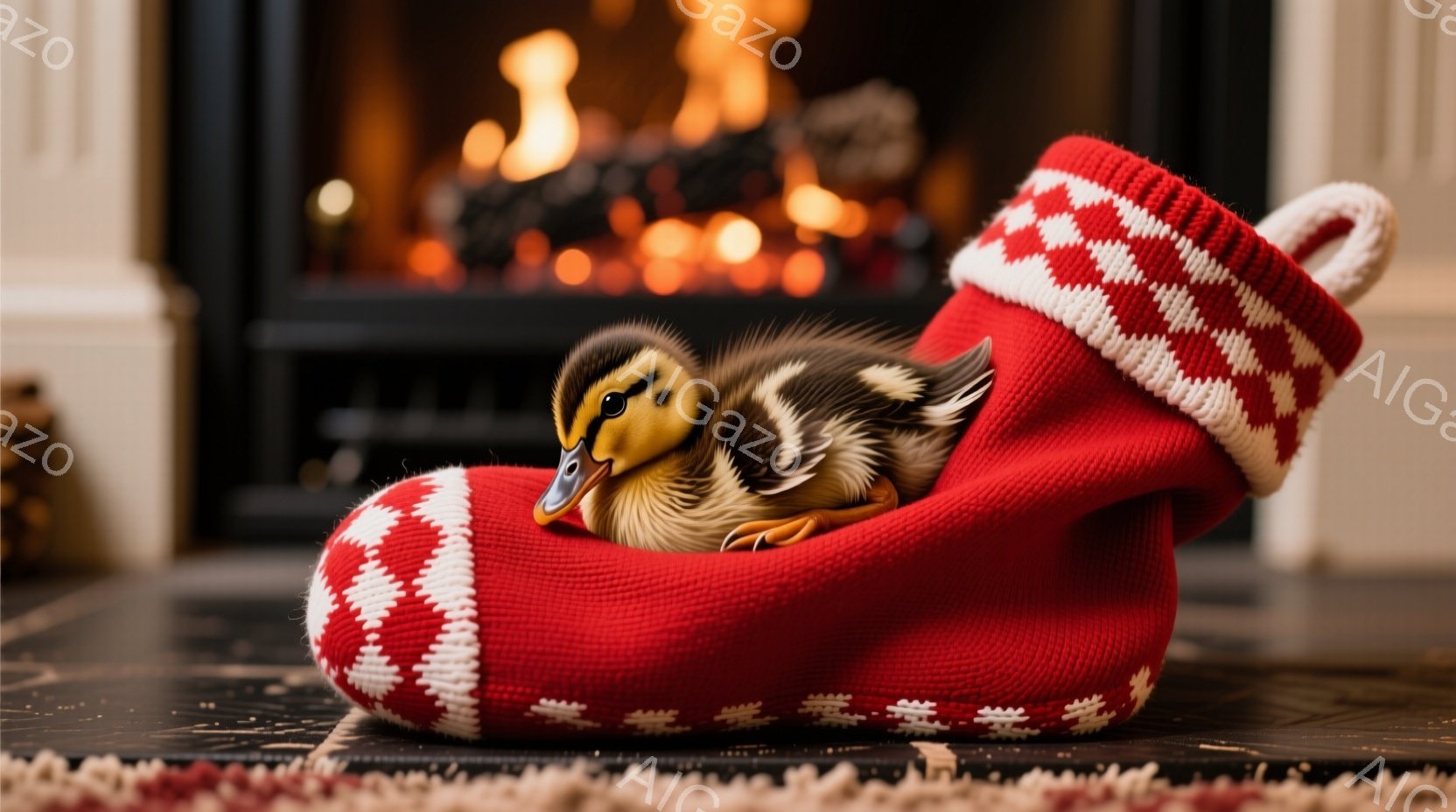 小さなアヒルの雛が、真っ赤なクリスマスストッキングの中に丸まって眠っています。ストッキングは白いフリルで飾られ、柔らかい毛糸で編まれています。背景には暖炉があり、炎が燃え盛る様子が暖かく、ほっとする雰囲気を作り出しています。