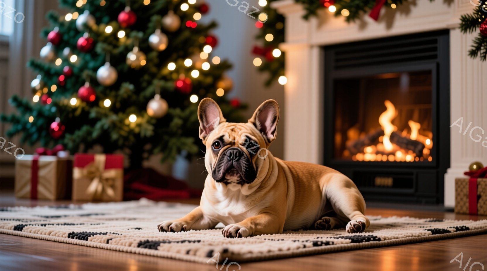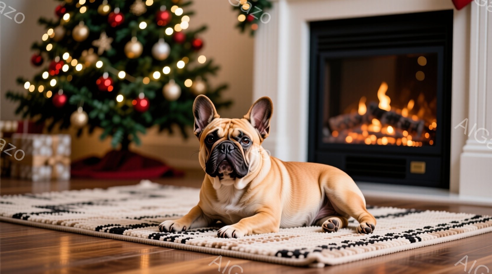 室内には、明るい色のラグの上にベージュ色のフレンチブルドッグが横たわっています。背景には、クリスマスツリーが飾られ、暖炉で火が燃えており、暖かく、居心地の良い雰囲気が漂っています。犬はリラックスした表情で、カメラに向かってまっすぐ見ています。