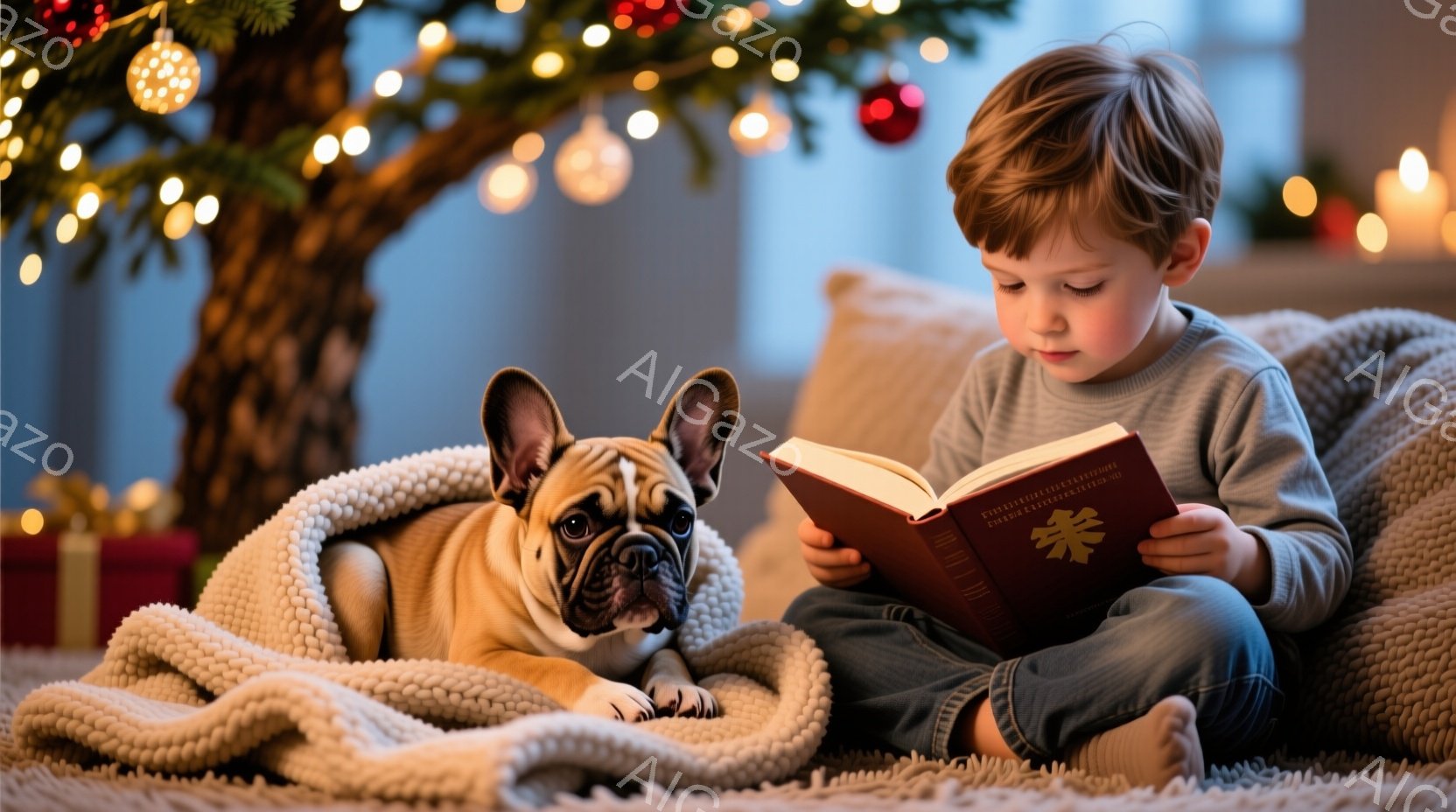 茶色の毛並みの小さなフランスブルドッグが、白い編み物のブランケットに包まれて床に座っています。少年は、グレーの長袖シャツとタンクトップ姿で、本を熱心に読んでおり、膝を抱えて座っています。背景にはクリスマスツリーが飾られ、暖かい光が部屋全体を照らし、居心地の良い冬の雰囲気を醸し出しています。