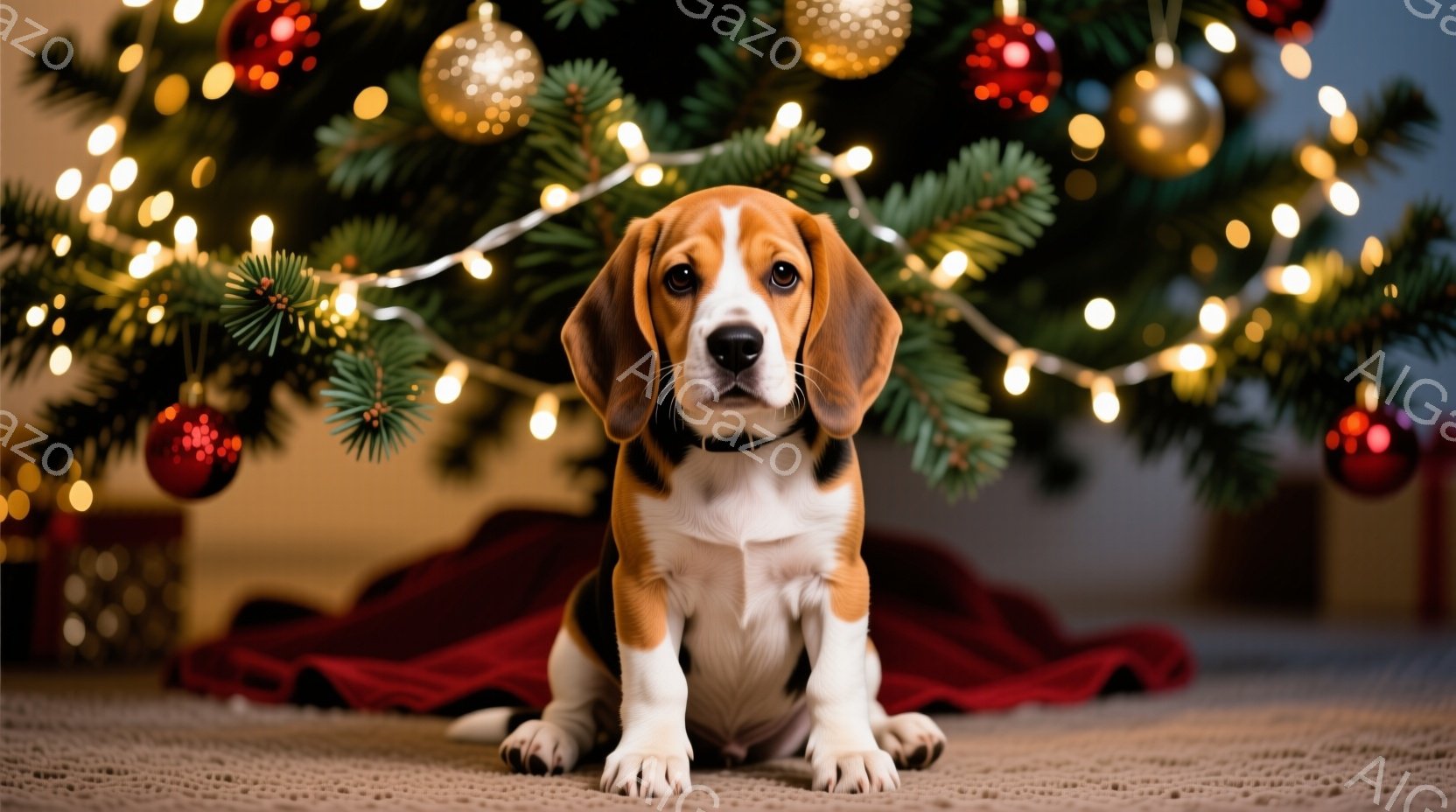 幼いビーグル犬が赤いチェック柄のブランケットの上に座って正面を見つめています。背景にはクリスマスツリーがぼんやりと見え、温かい光で飾られたオーナメントが輝いています。全体的に、暖かく、お祝いムードに満ちた、居心地の良い雰囲気が漂っています。