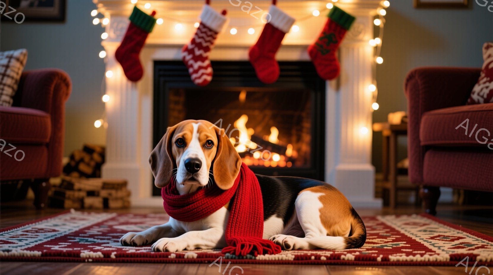 暖炉の前に茶色と白のビーグル犬が、赤いマフラーを巻いて横たわっています。背景にはクリスマスストッキングと光る電飾があり、部屋全体が温かい雰囲気で満たされています。犬は正面を見ており、落ち着いた表情をしています。