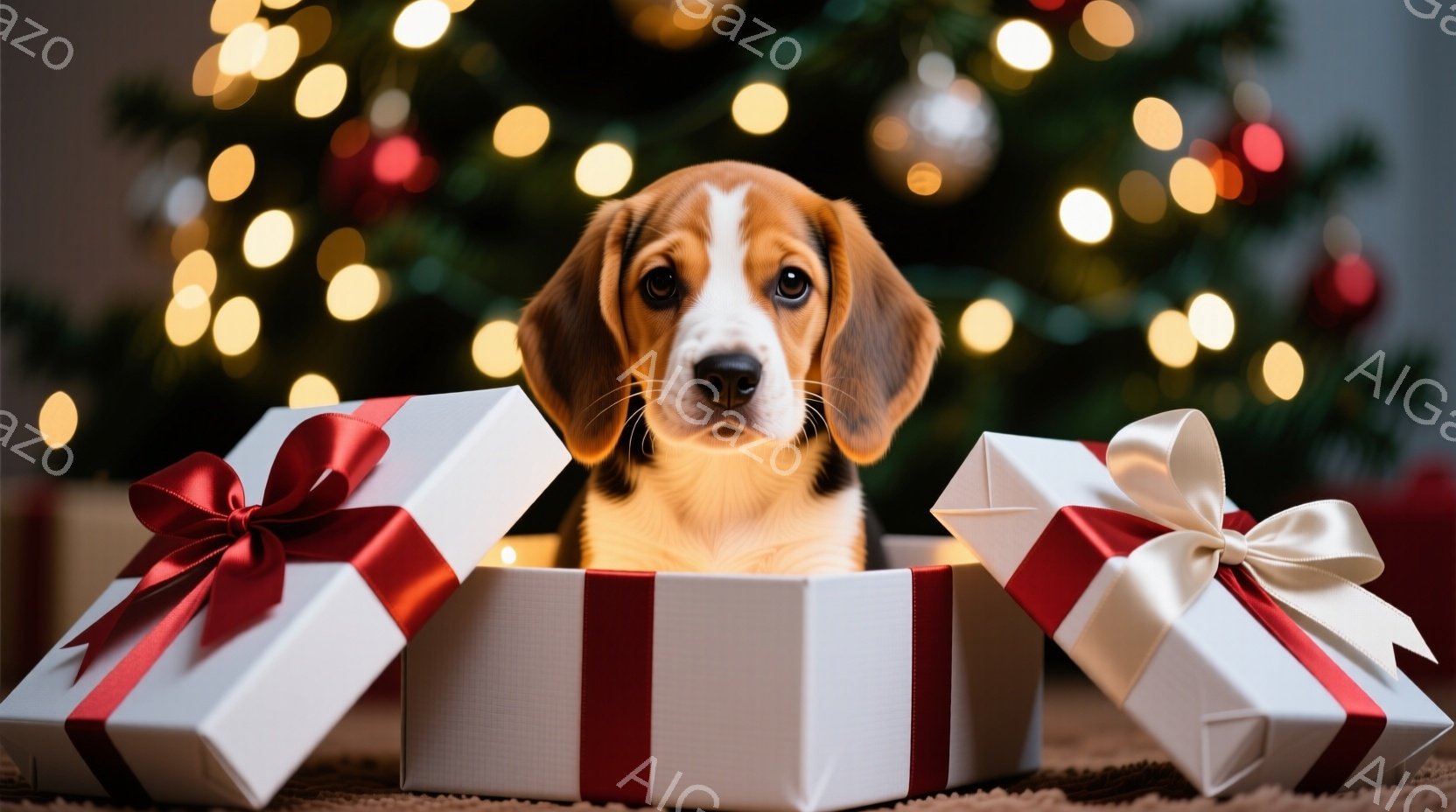 茶色と白の毛並みを持つ子犬が、赤いリボンで飾られたプレゼントボックスの中から顔を出しています。背景にはぼやけたクリスマスツリーの光が輝き、暖かくお祝いの雰囲気です。子犬は好奇心旺盛な表情で、カメラを見つめています。