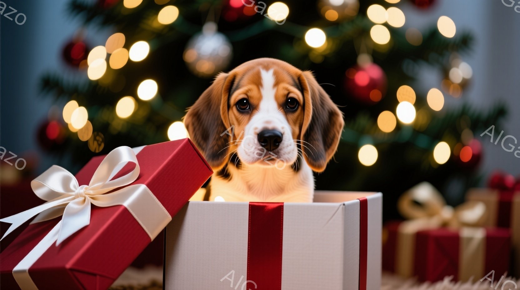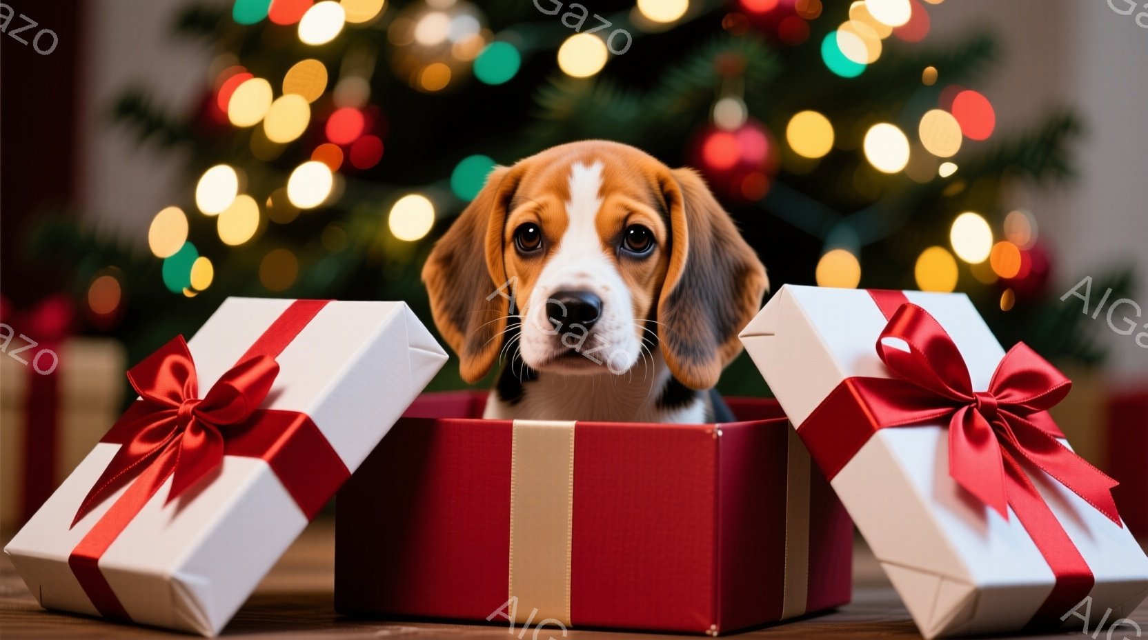 子犬が白いギフトボックスから顔を出しています。ボックスは赤いリボンで飾られており、背景にはぼやけたクリスマスツリーの光が輝いています。暖かく、お祝いの雰囲気で、子犬の愛らしい表情が魅力的です。