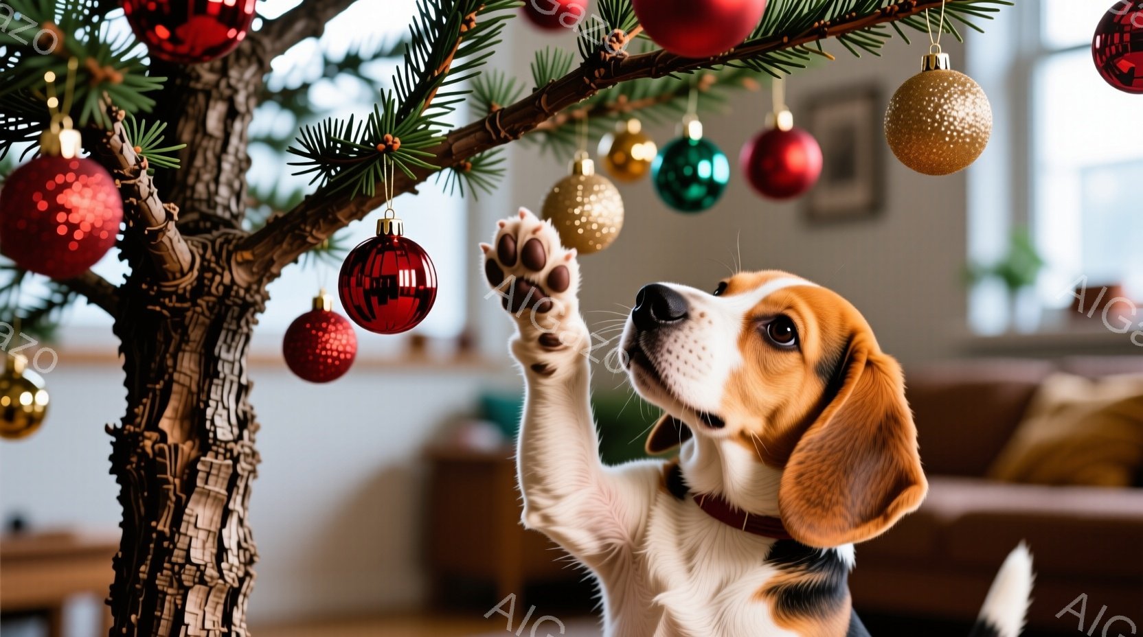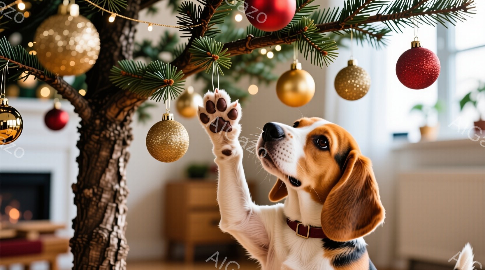 ビークル犬がクリスマスツリーに向かって前足を伸ばし、赤いオーナメントを見つめています。犬は明るい茶色と白の毛並みで、好奇心と楽しさが表情に表れています。背景には暖炉や家具が見え、室内の温かく穏やかなクリスマスの雰囲気が漂っています。