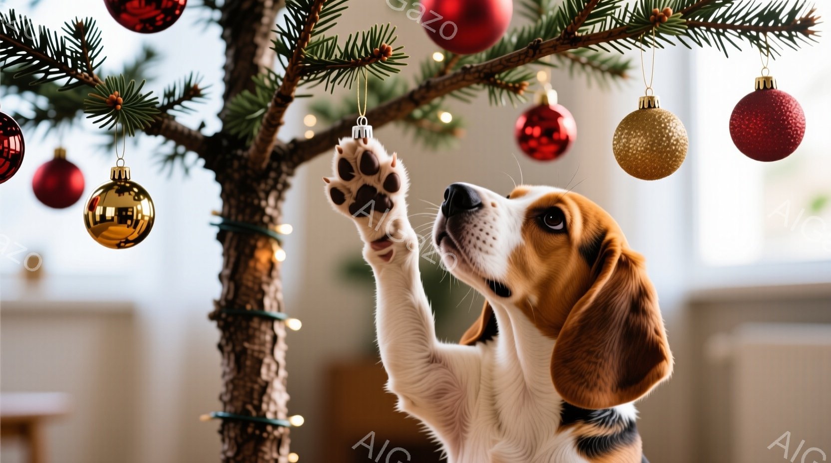 ビークル犬がクリスマスツリーに手を伸ばしている写真です。犬は首輪をしており、興奮した表情で上を見上げています。背景には暖炉や植物が見え、温かく家庭的な雰囲気が漂っています。