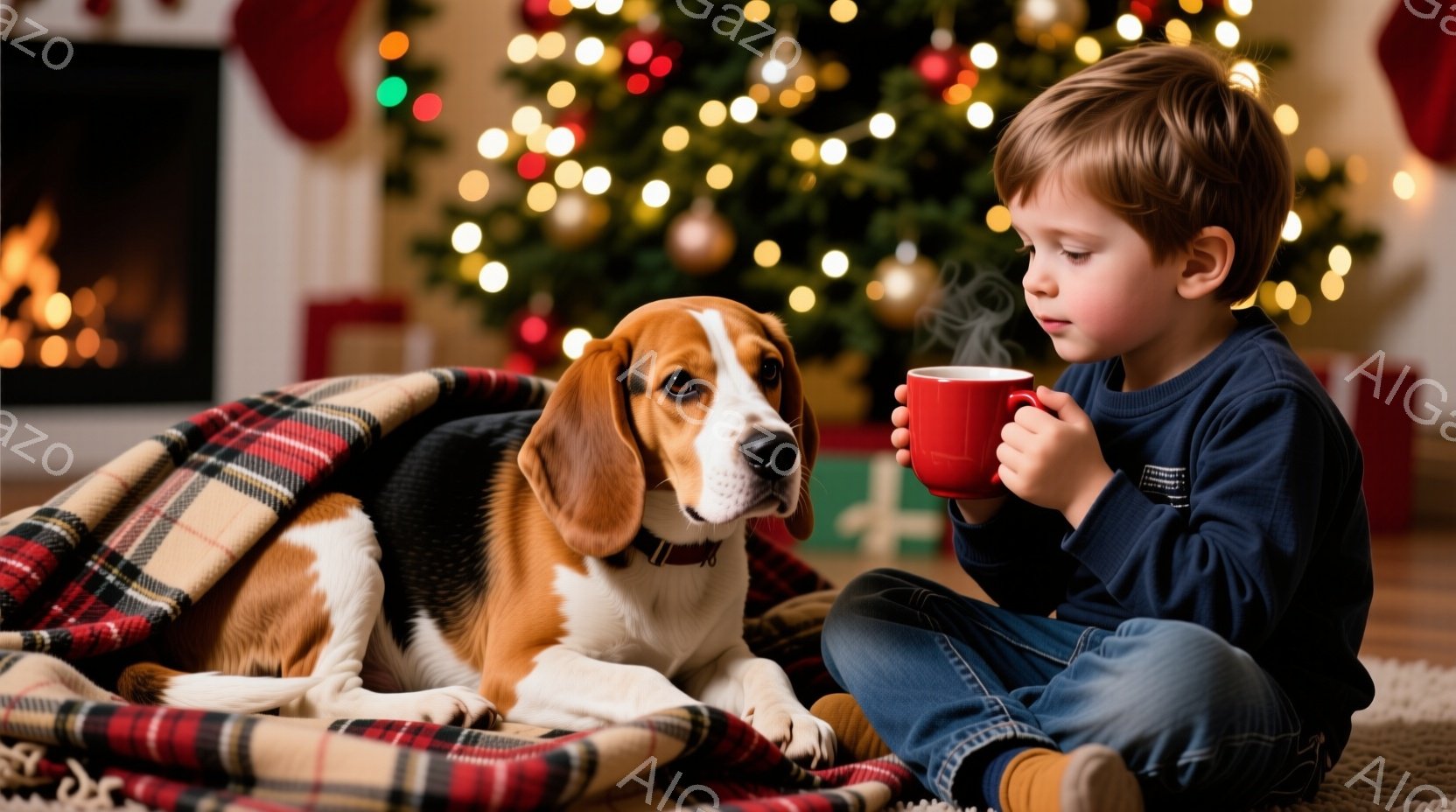 少年はチェック柄のシャツとジーンズを着て、床に座り、湯気を立てるマグカップを両手で抱えています。隣には、チェック柄のブランケットの上に横たわる茶色のビーグル犬がおり、リラックスした様子でこちらを見ています。背景にはクリスマスツリーが飾られ、暖炉の光が柔らかく室内を照らし、温かく穏やかなクリスマスの雰囲気が漂っています。