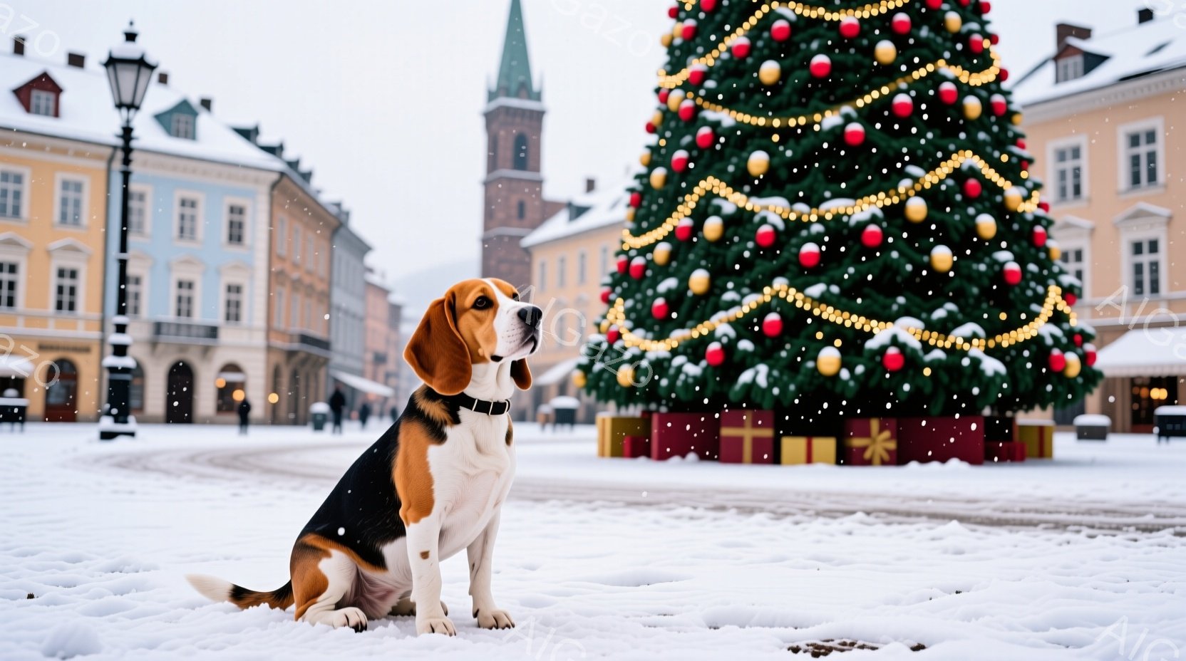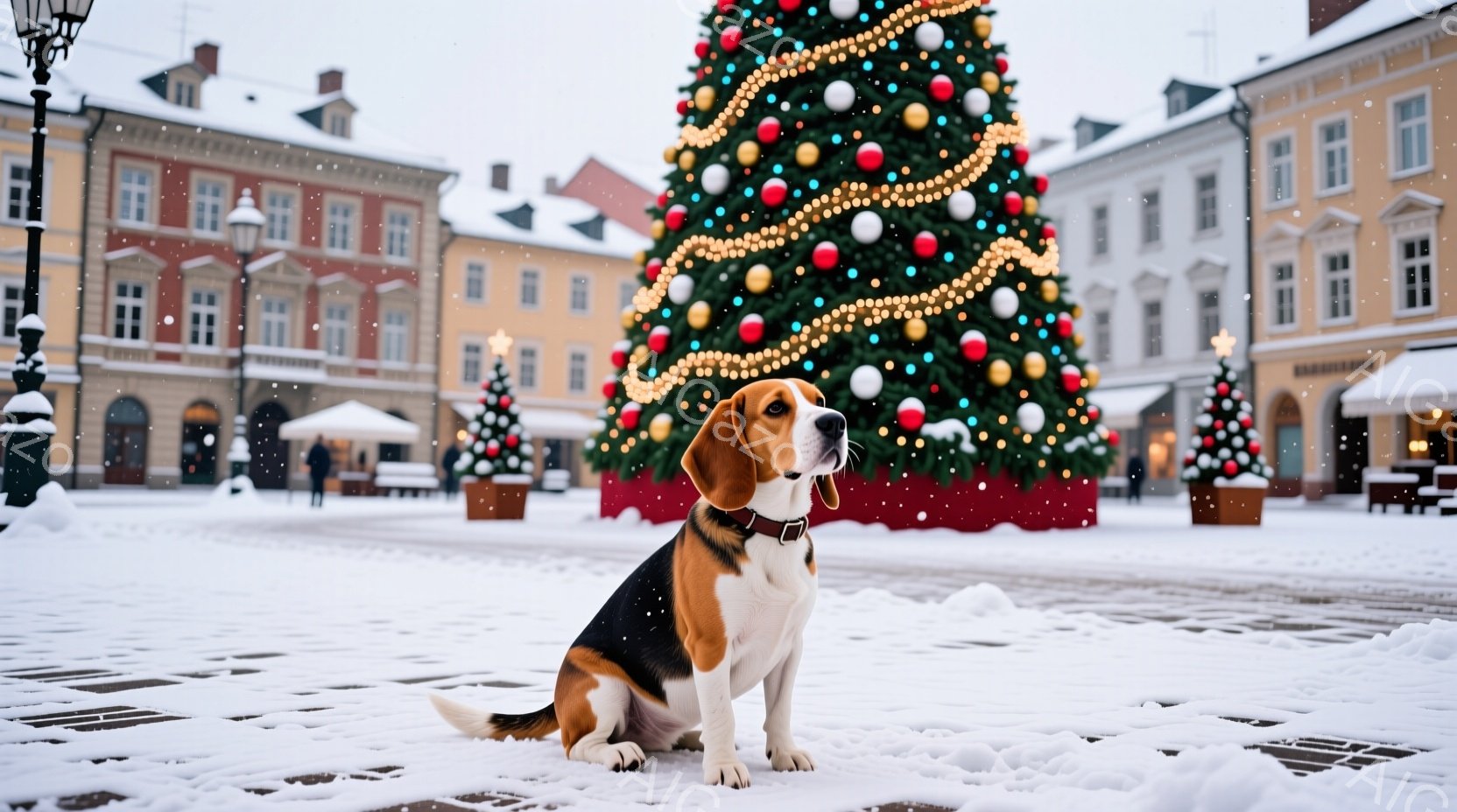 広場に立つビーグル犬が、クリスマスツリーの前で座っています。雪が舞い降りる中、犬はまっすぐ前を見つめ、落ち着いた表情を浮かべています。背景にはカラフルな建物が立ち並び、クリスマスの飾り付けが施された街並みが広がっています。