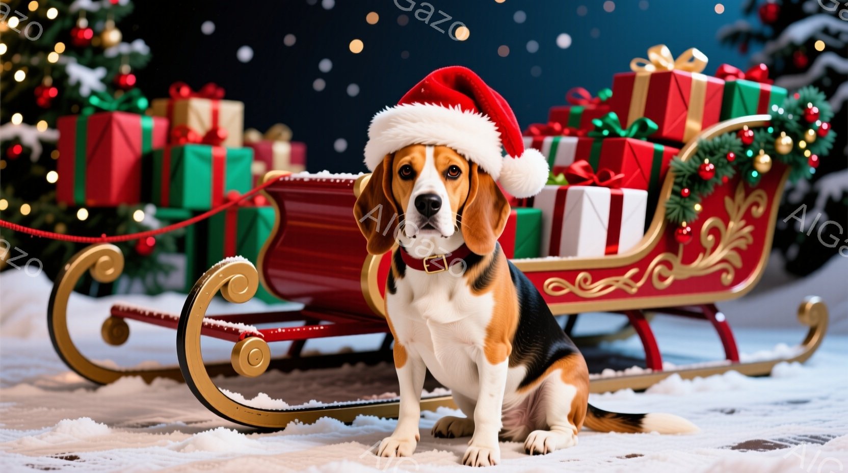 白と茶色のビーグル犬が、クリスマスのサンタの帽子をかぶって雪の上に座っています。背景には、クリスマスツリー、プレゼントの山、そして飾り付けられたそりが置かれています。全体的に、暖かく、お祝いの雰囲気で、クリスマスシーズンを象徴する心温まるシーンです。